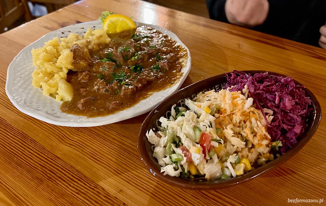 - w skład koryta dla jednej osoby (30 PLN) wchodziły smażone ziemniaki, dwa pierogi, karkówka, kurzęca pierś, kiełbasa oraz smaczny, niesztuczny czosnkowy sos. D. nie lubi proponowanej do tego zestawu zasmażanej kapusty, ale to nic – naświetlił temat kelnerce, a ta bez zbędnych komentarzy zaproponowała wymianę na zestaw surówek. Mięsom brakowało idealnej soczystości, ale do podeszw także było im daleko – z lekkim czosnkowym sosem wchodziły miodzio. D. ocenił korytko pozytywnie i niemalże do zera wymiótł wszystkie jego składowe.