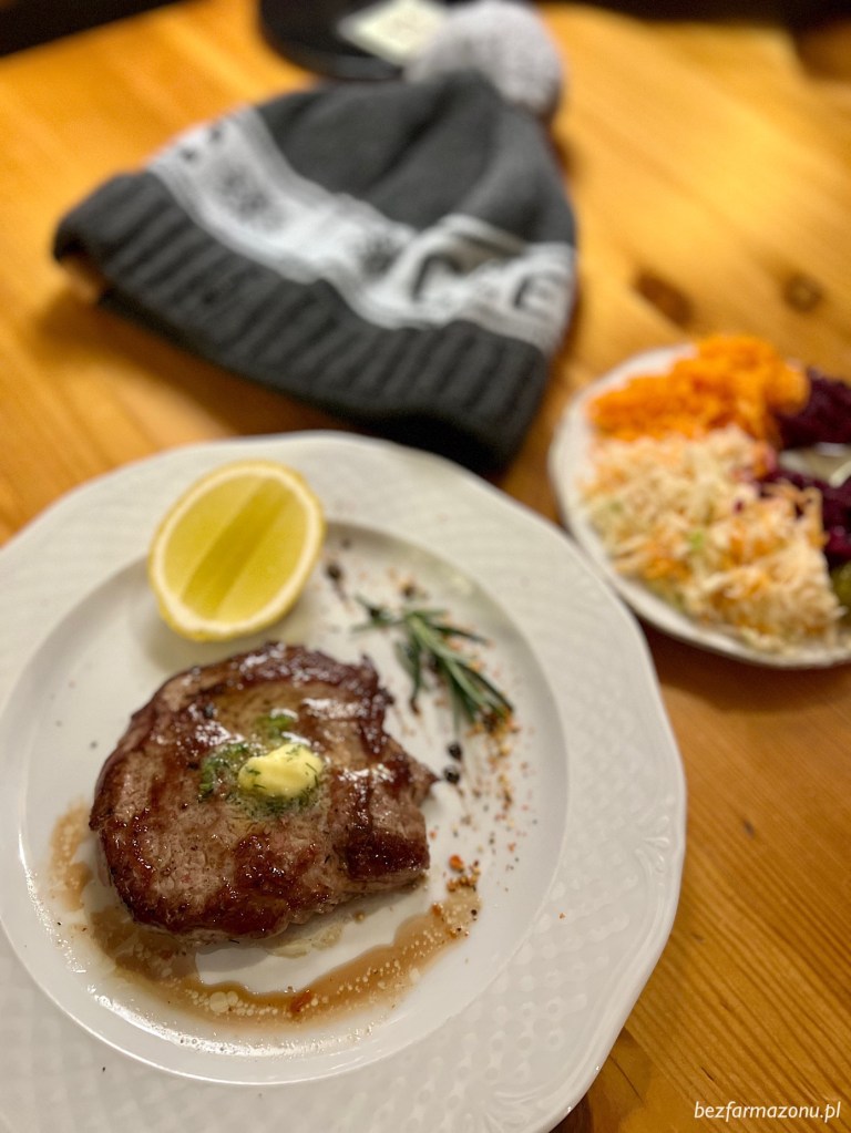 Mięcho wysmażono medium, było miękkie i soczyste – owego kąska nie powstydziłaby się dobra krakowska restauracja. Nie był to poziom najlepszych steakhousów, ale jak na karczmę przy trasie naprawdę fair.