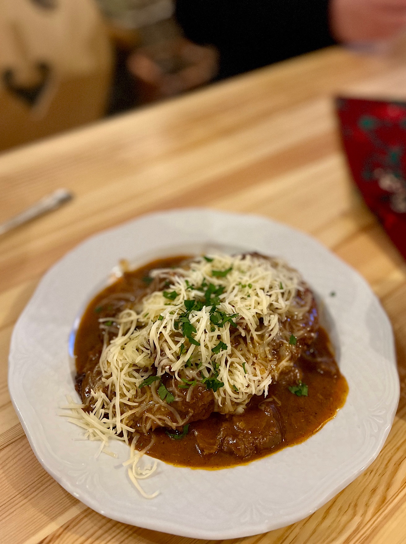 A. zamówiła cebulową z grzankami z masłem i czosnkiem (8 PLN) i swoją polewkę oceniła bardzo dobrze. Skubnąłem jej grzankę i również nie mogę mieć ku niej żadnych zastrzeżeń.