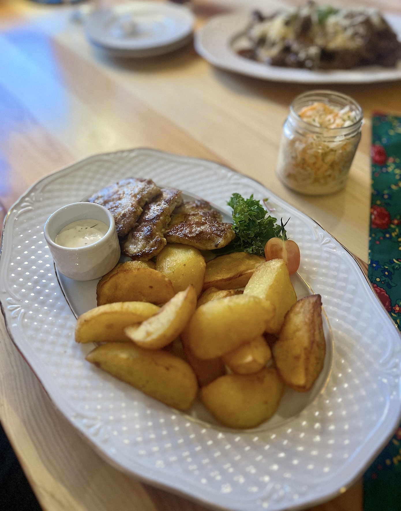 - panierowane paluszki z kurczaka (10 PLN) z frytkami (5 PLN) jakby nie patrzeć nie reprezentują typowego, góralskiego, karczmowego jedzenia, ale D. mimo wszytko się na nie uparł. Nie były złe, ale zdecydowanie dalekie od idealnych. Czemu niektóre frytki były jasne, a inne ciemne? Obym się mylił, ale te smażone po raz drugi tak właśnie ciemnieją