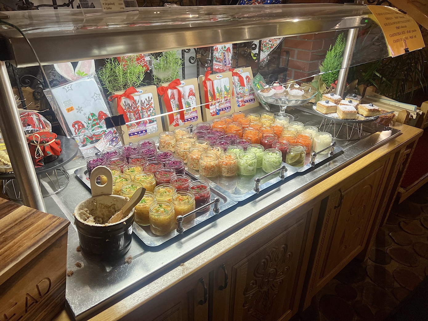 Ja poprosiłem o pierogi ruskie (22 PLN) oraz z baru sałatkowego skomponowałem zestaw surówek (10 PLN). Pierogi zaskoczyły wielkością – sztuk chyba dwanaście z dobrze przyprawionym farszem oraz w sam raz ciastem. Teraz są godne powtórzenia – kiedyś były mizerne.