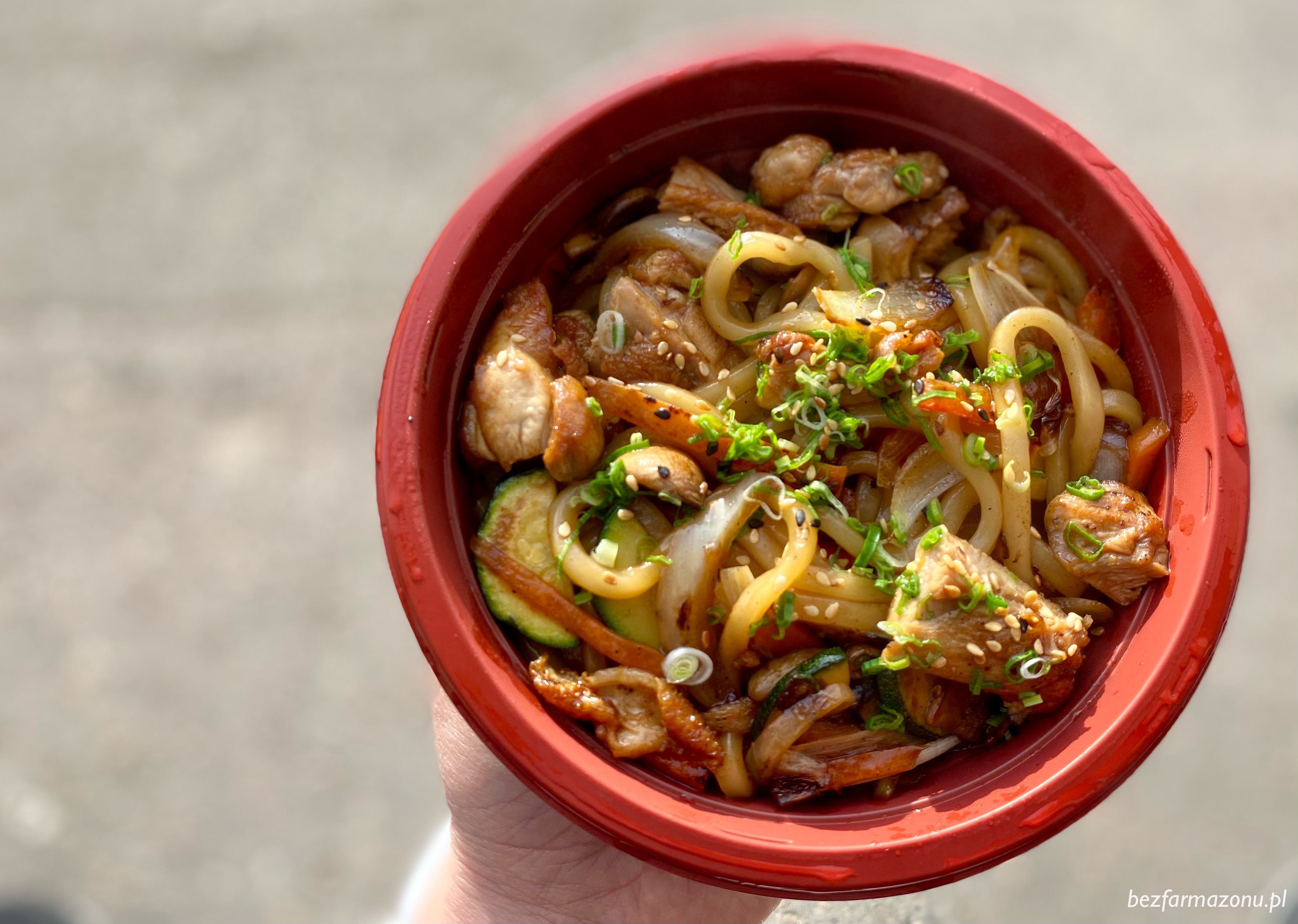 Yakiudong (27 PLN) to gruby i sprężysty makaron usmażony z warzywami i soczystym mięsem ud kurczaka z mięciutką skórką. Danie o super mocnym ostrygowym aromacie oraz delikatnej, napędzanej przez teriyaki słodyczy. Dawno nie jadłem tak pysznego azjatyckiego makaronu.