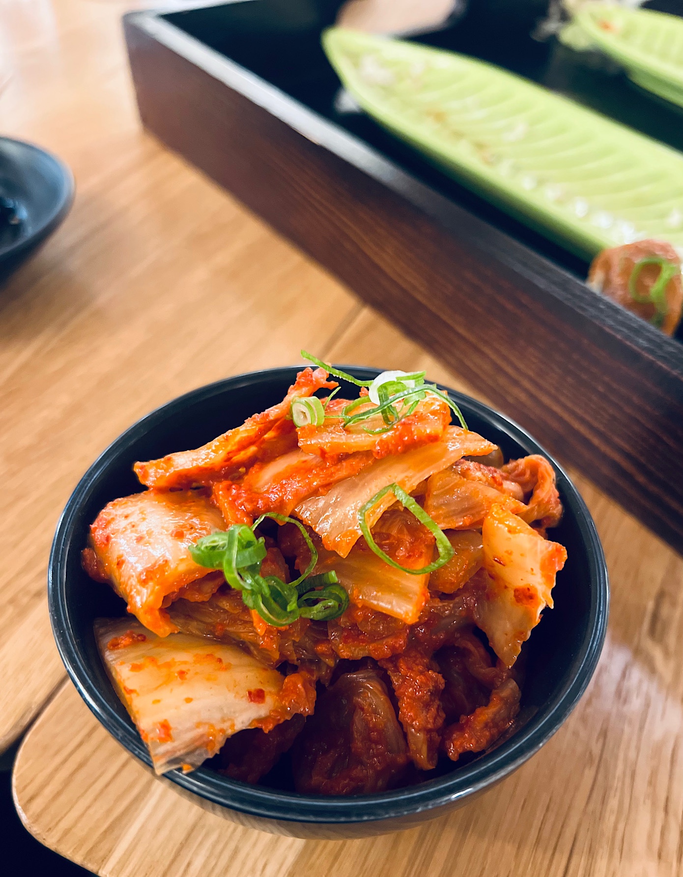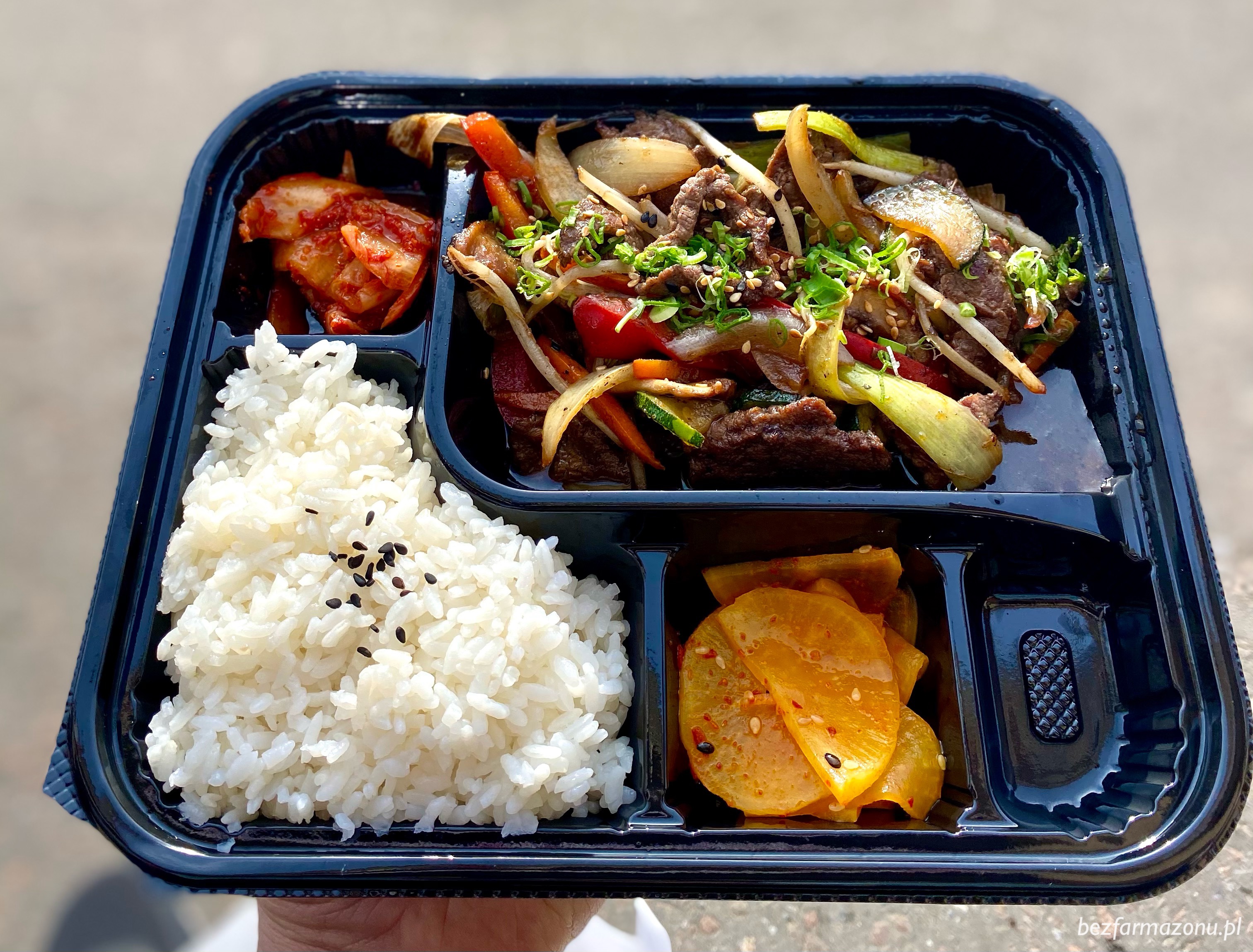 Bulgogi (35 PN) – marynowana, jędrna, dobrze wysmażona, nieżylasta wołowina, sos sojowy z cebulą, czosnkiem i olejem sezamowym, warzywa stir fry, niepikantne kimchi, ryż. Dodatkowy smaczek niósł prażony biały i czarny sezam. Danie sycące, bogate w walory smakowe i pachnące Azją na kilometr. Naprawdę niezłe.