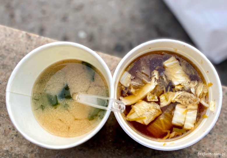 Tradycja na bazie pasty sojowej czyli Miso (9 PLN) oraz gratisowa rybna na wywarze z owoców morza z kawałkami łososia. Pierwsza lekko słona, z glonami, tofu i grzybami shitake. Druga słodsza, pikantniejsza i zdecydowanie tłustsza.