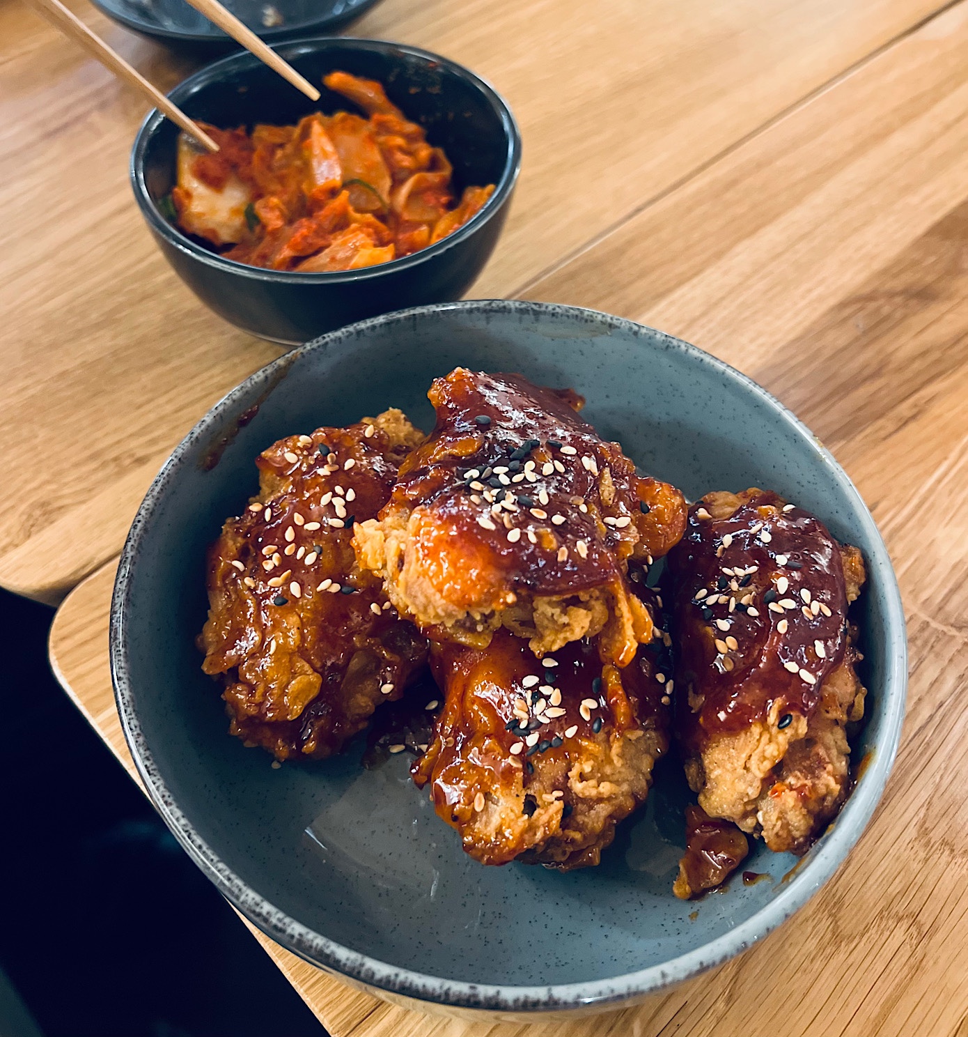 Po uporaniu się z powyższymi polecieliśmy z krewetkami w tempurze (3szt. – 37 PLN), gyozami z warzywami i krewetkami (28 PLN), kimchi (19 PLN) oraz chrupiącymi skrzydełkami w turbo lepkim, słodko – ostrym sosie (36 PLN).