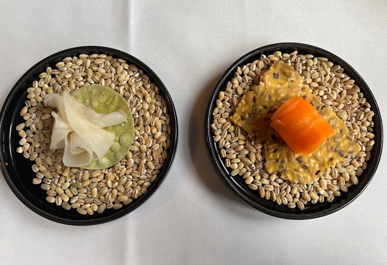 Amouse bouche 2 – podpłomyk z wędzoną słoniną; chlebek szwedzki z marynowaną marchwią i kalarepą.
