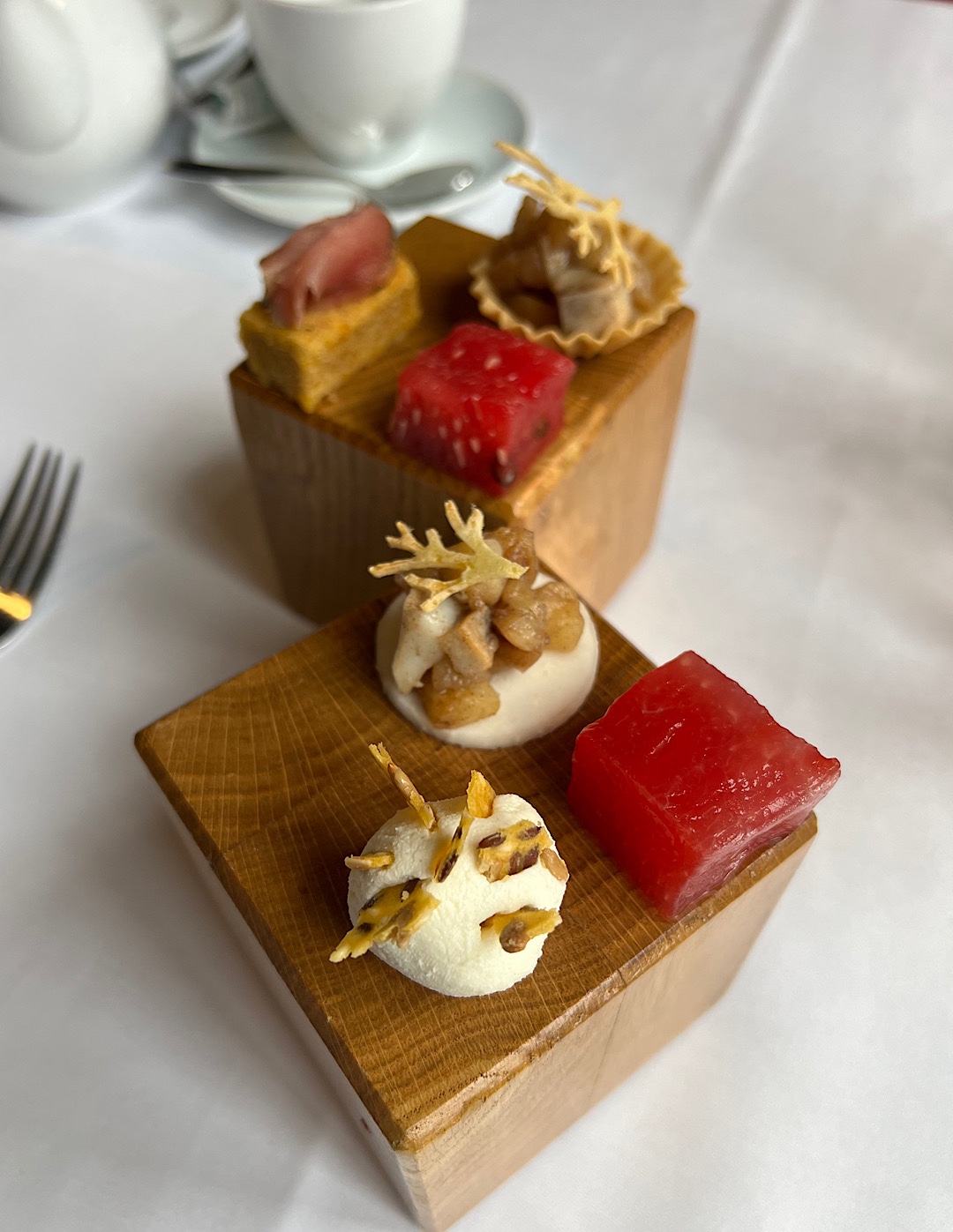 Amuse bouche 3 – marynowany arbuz, sałatka śledź jabłko w ciastku / na plastrze kalarepy, bryndza, ciasto marchewkowe z półgęskiem.