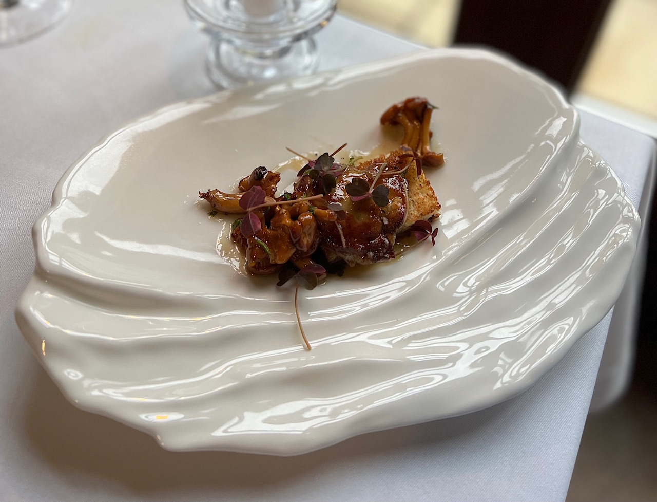 Kurs 2 – zapiekany kozi ser z kiszonymi pomidorkami; chałka z foie gras – w obydwu wersjach kurki na miodzie wrzosowym.