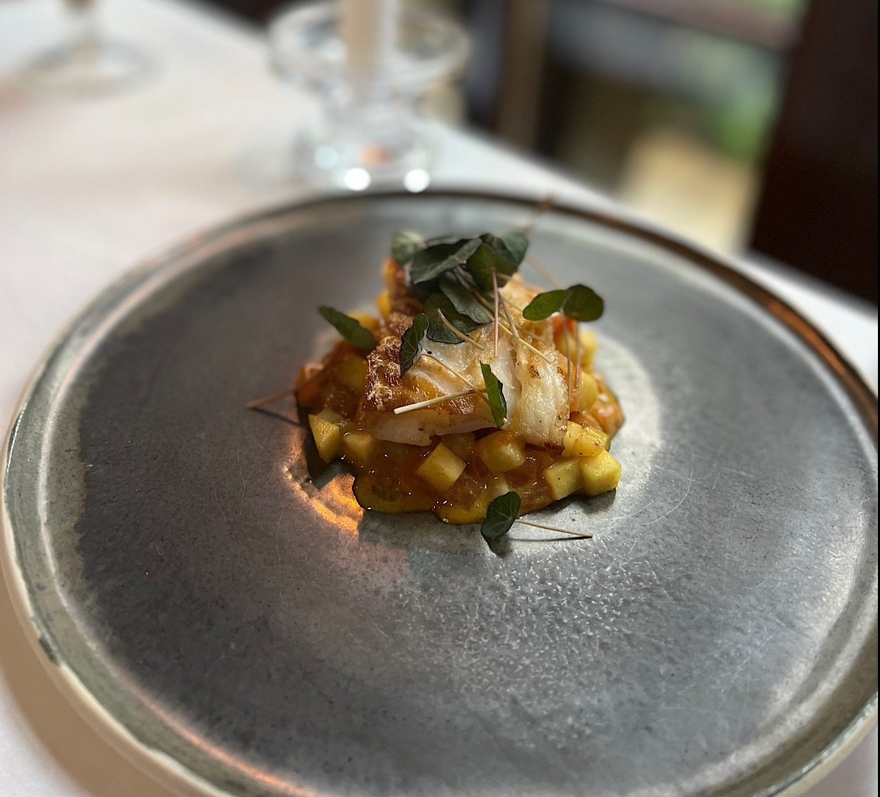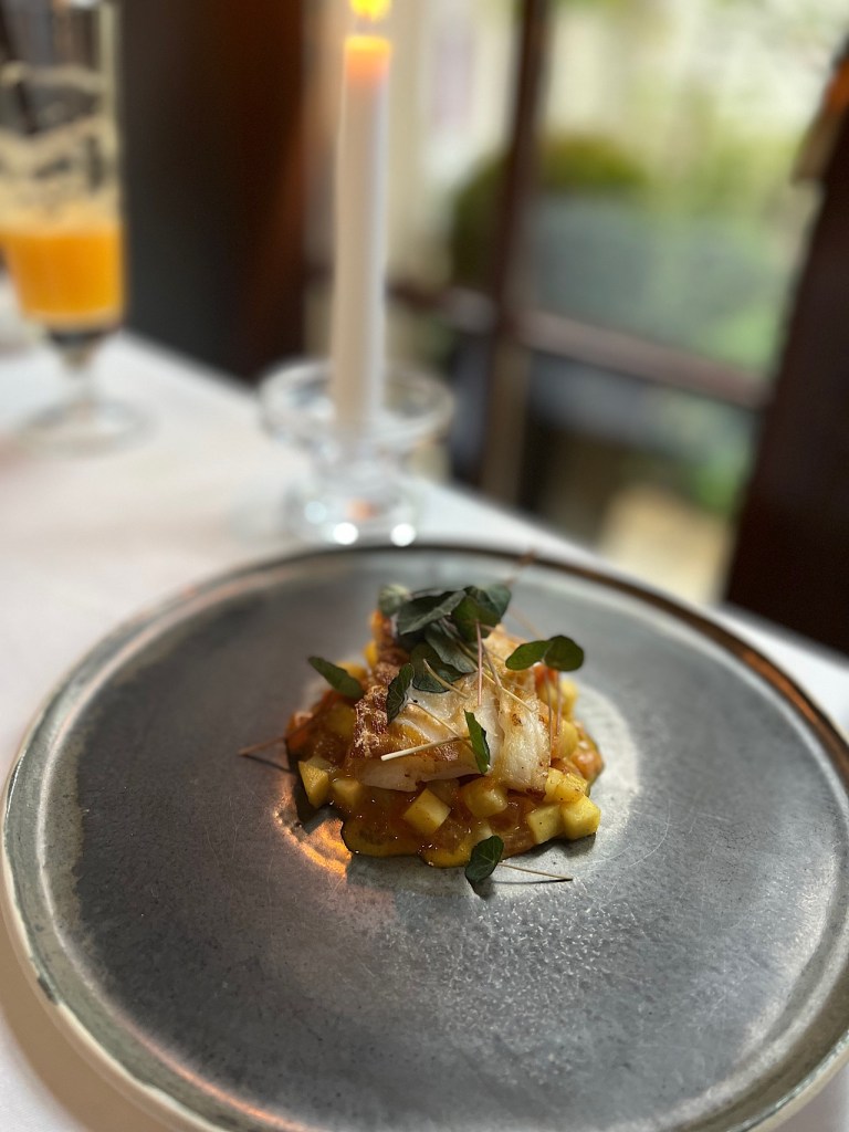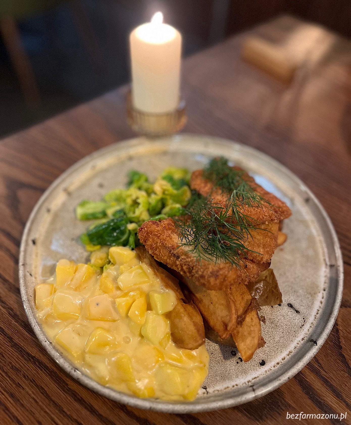 Danie numer trzy – dorsz w panko, mango chutney oraz brukselka na miodzie i maśle z chilli (58 PLN).