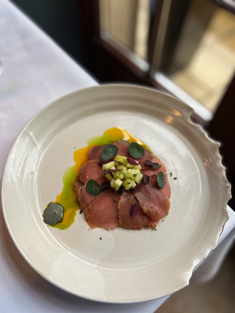 Wizualnie kucharz dopracował to danie w najmniejszym szczególe i zarazem rozpieścił nasze podniebienia. Wszystkie składniki były tak perfekcyjnie połączone, że bardzo trudno je osobno opisywać. Kęs po kęsie sprawiał, że danie stawało się naszym numerem jeden kolacji. Doskonale przyrządzone mięso bażanta, nieziemsko kremowe ziemniaki ze stopniowo uwalniającym się truflowym aromatem genialnie ze sobą współgrały.