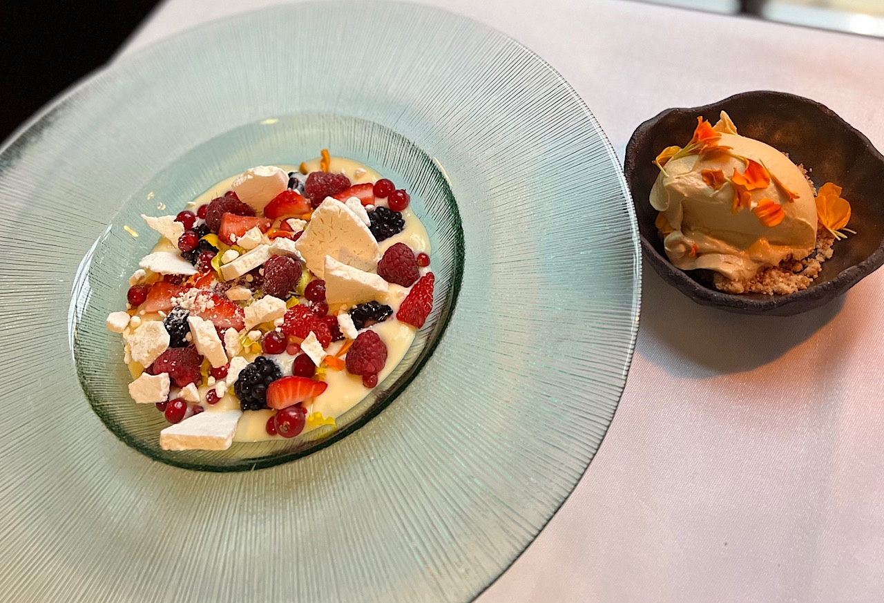 Kurs 6 – krem patisierre z bezą i owocami lata; ciasto ucierane z jagodami, wiśnie – w obydwu przypadkach sorbety milaberkowe.