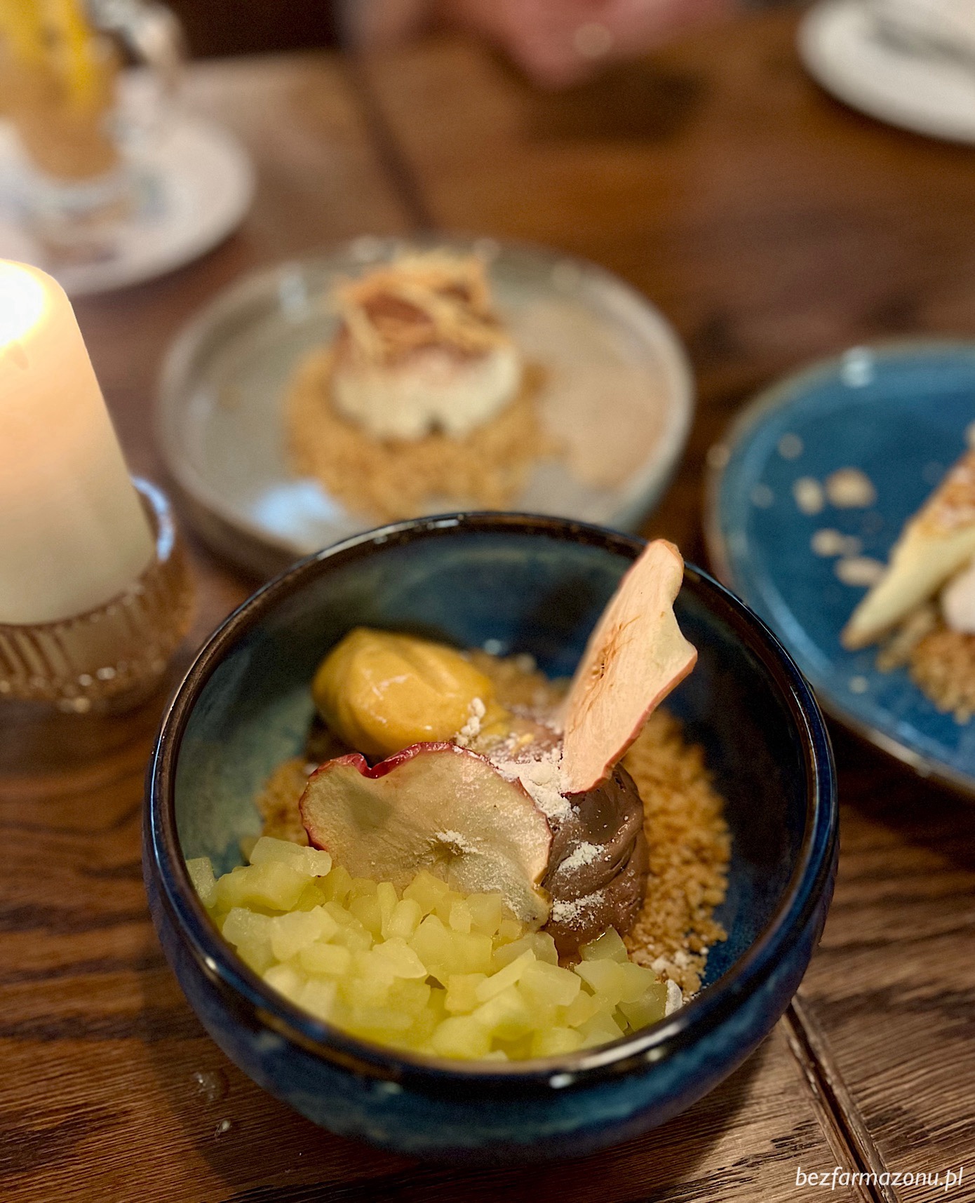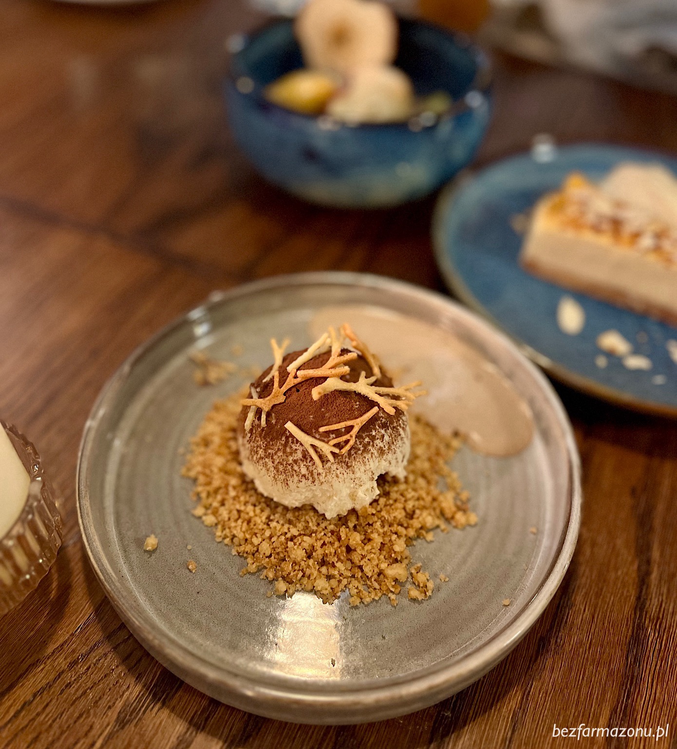 Dostaliśmy sernik z białą czekoladą, cynamonem i wanilią; prażone jabłko z kremem z ciemnej czekolady i mirabelką; tiramisu w formie kuli.