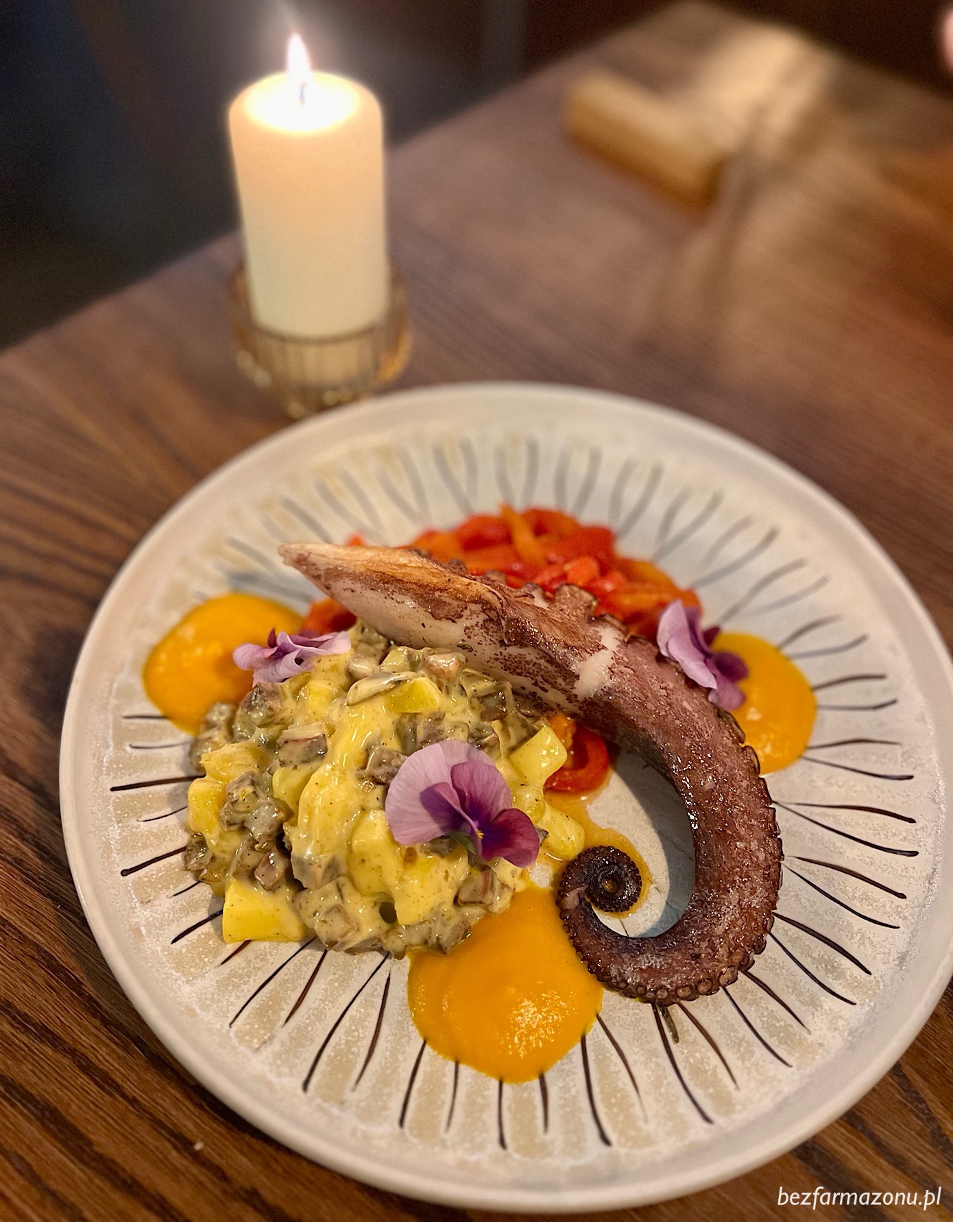 Na ostatnim talerzu królowała macka ośmiornicy w towarzystwie harrisy i tym samym co wyżej mango chutney, jednak wzbogaconym o pikantną kiełbasę od Gawora (89 PLN).