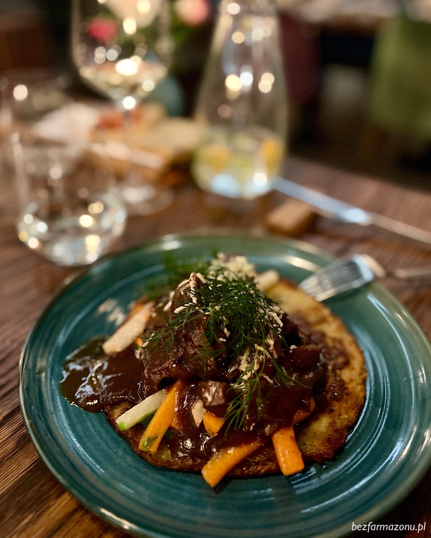 Wołowinę na miękko z pieczonymi warzywami podano na wysmażonym w punkt placku ziemniaczanym (69 PLN). Zaskakującym pomysłem okazała się rozsmarowana na jego wierzchu pasta z zielonego groszku.