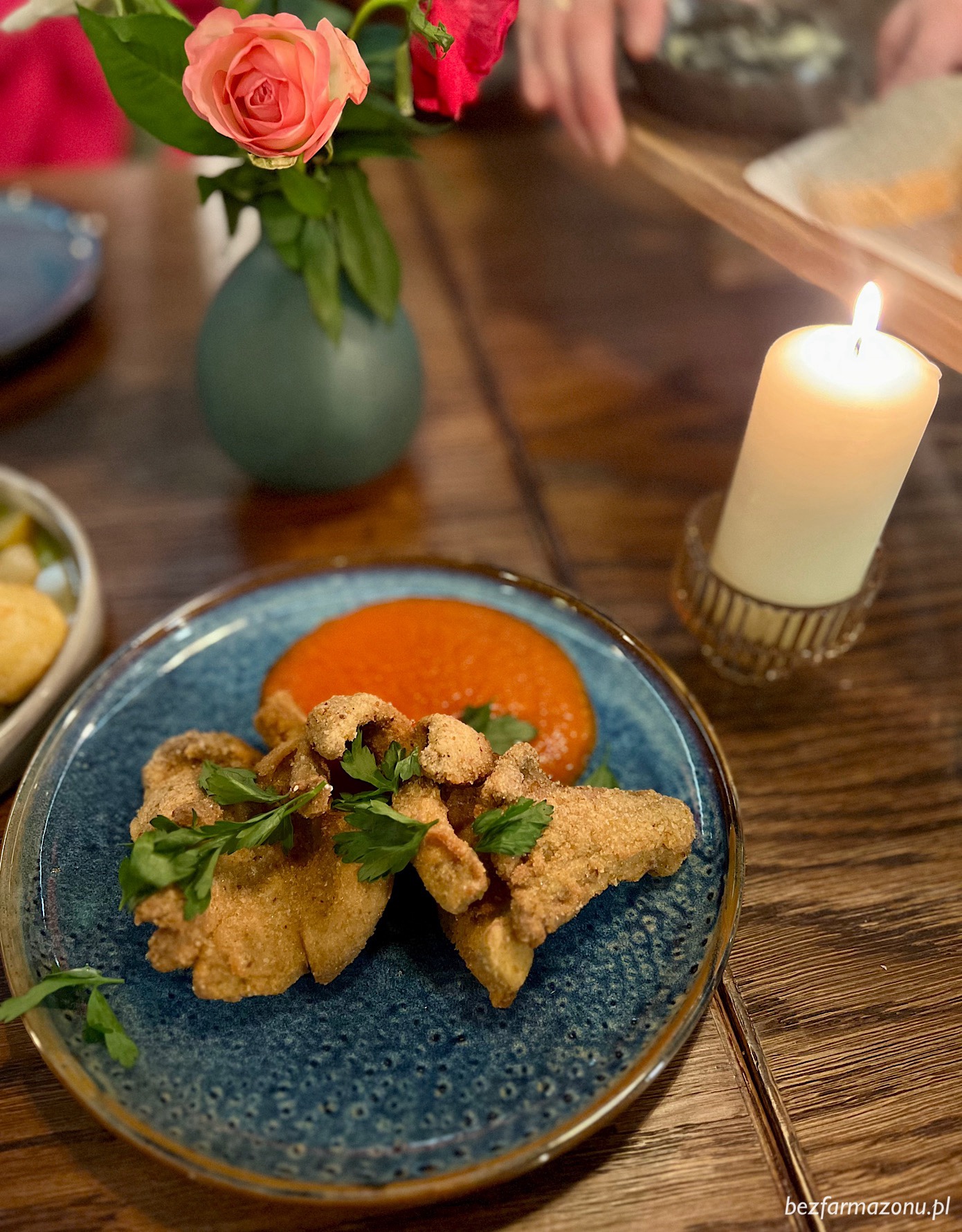 Ostatnią z przystawek były panierowane boczniaki z dipem z papryki pieczonej z tabasco (29 PLN). Tutaj sos okazał się nijaki – brakowało ostrości, brakowało soli. Ba, nie było żadnej wyczuwalnej przyprawy. Natomiast grzybki przygotowano bez zarzutu.