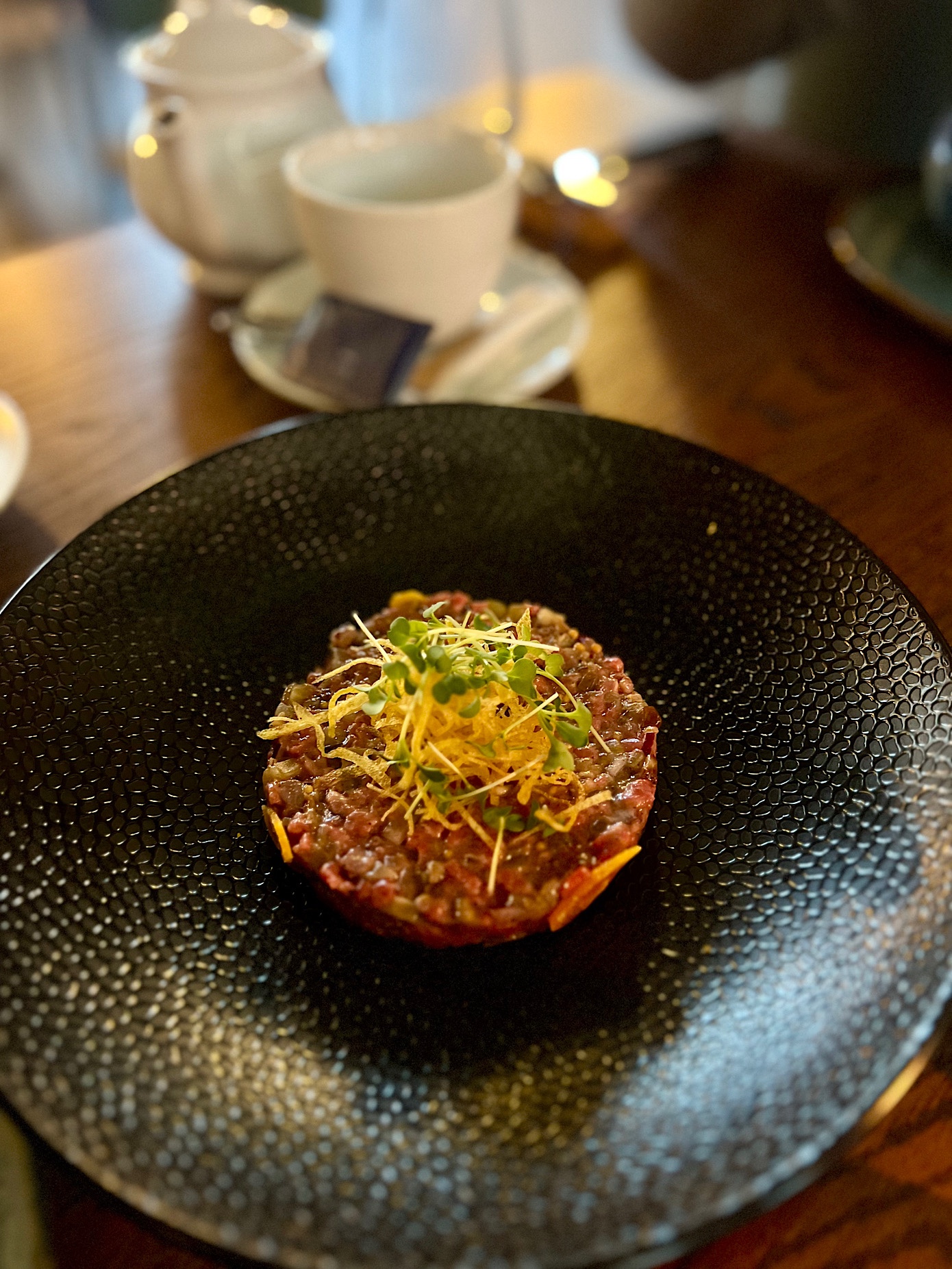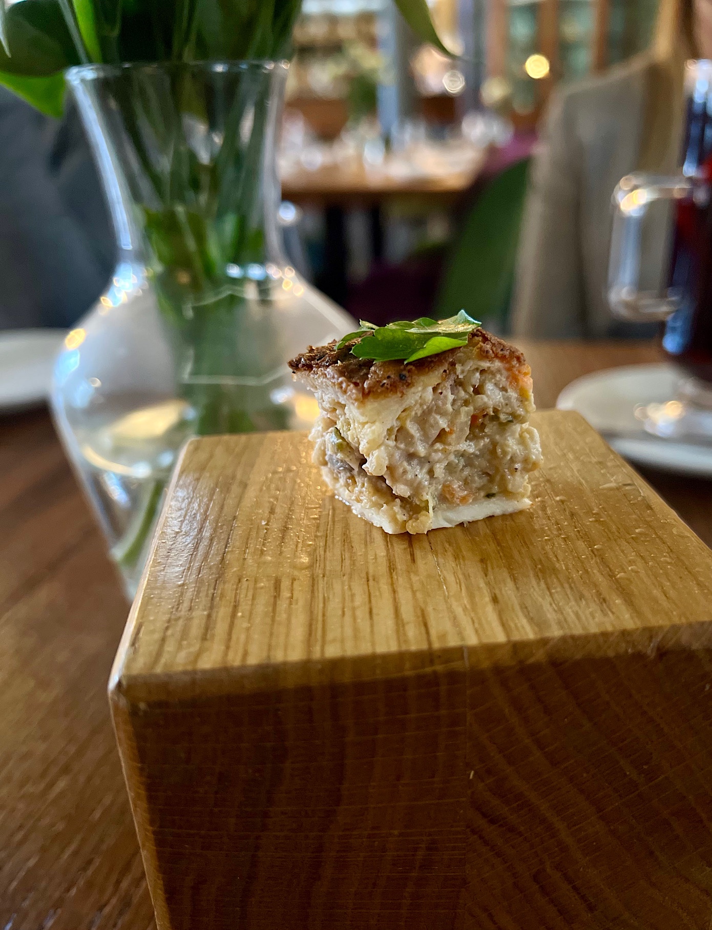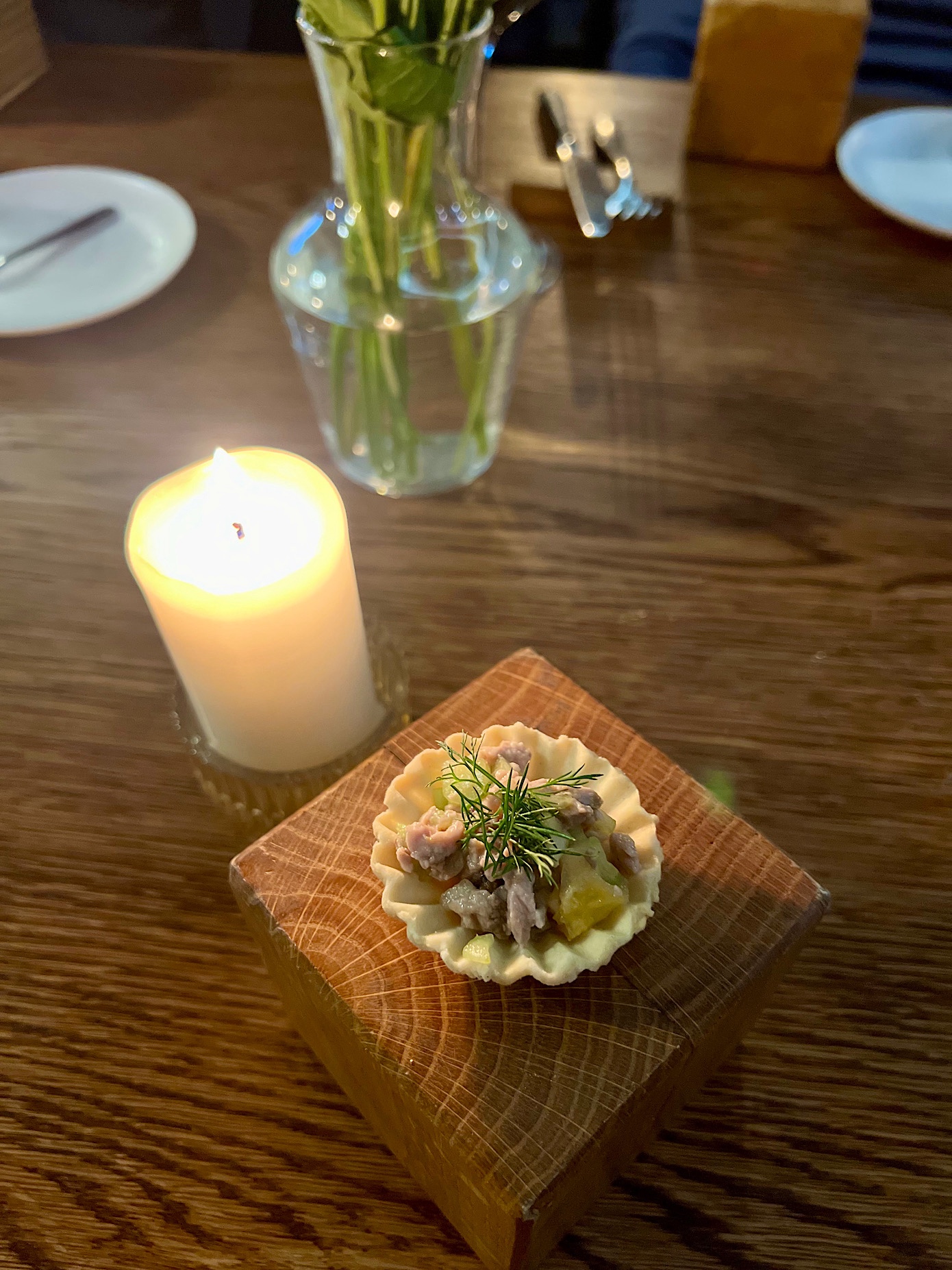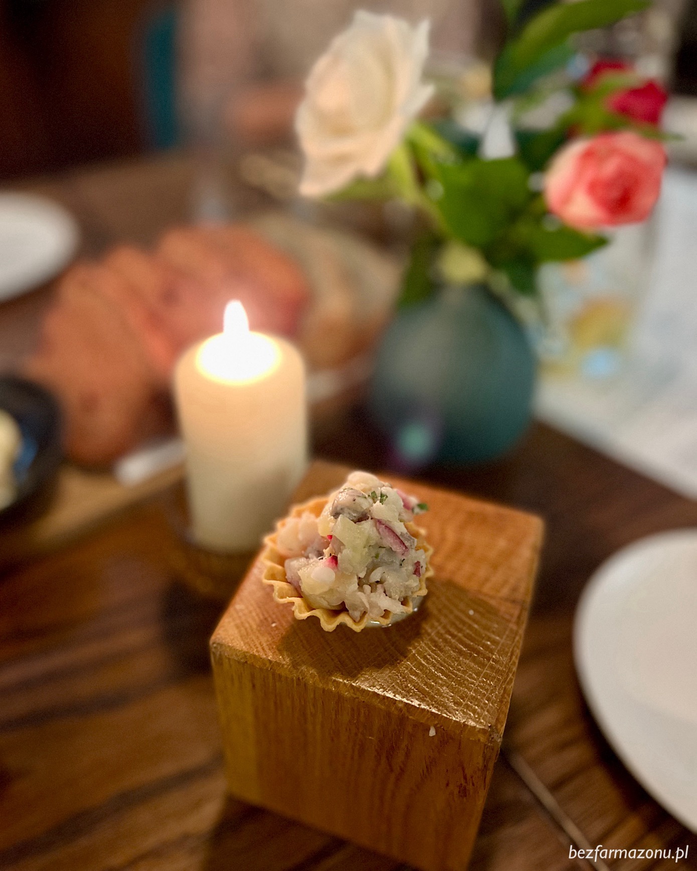 Po zajęciu miejsc otrzymaliśmy amouse bouche – tatar ze śledzia w foremce z kruchego ciasta.