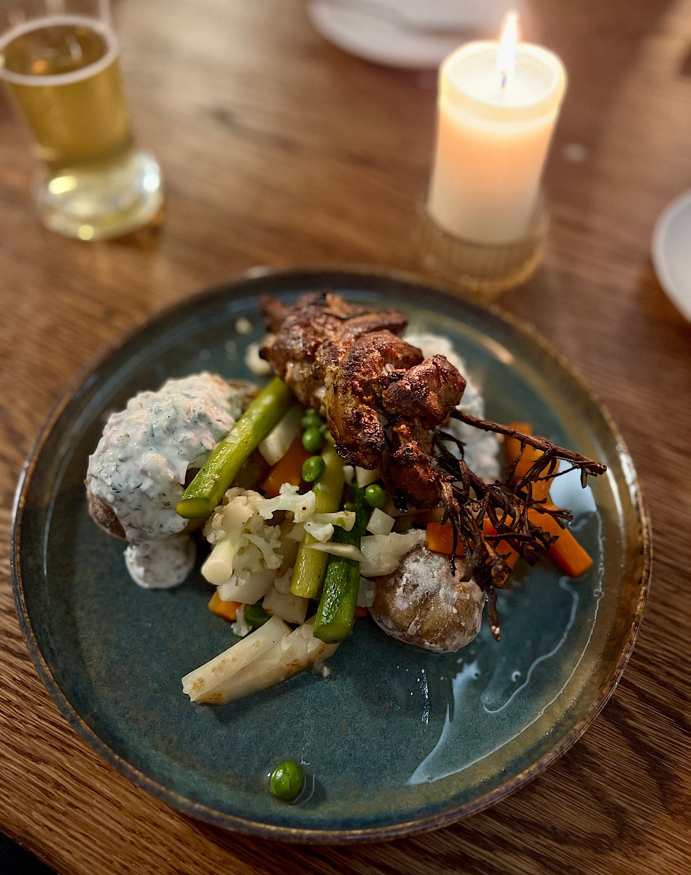 Polędwiczki wieprzowe w ziołach, rozmaryn, ziemniak w popiele, warzywa wiosenne , zielony pieprz (52 PLN), wołowina duszona w czerwonym winie, młody ziemniak, wiosenne warzywa, oscypek (79 PLN), schabowy ze świni złotnickiej z kością, młody ziemniak, młoda kapusta (69 PLN), pierś z kaczki, ptyś z kiełbasą od Gawora, groszek cukrowy, marchewka baby, porto (98 PLN), pierogi z nowalijkami i kolendrą, sos z ogórka małosolnego, szalotka (38 PLN).