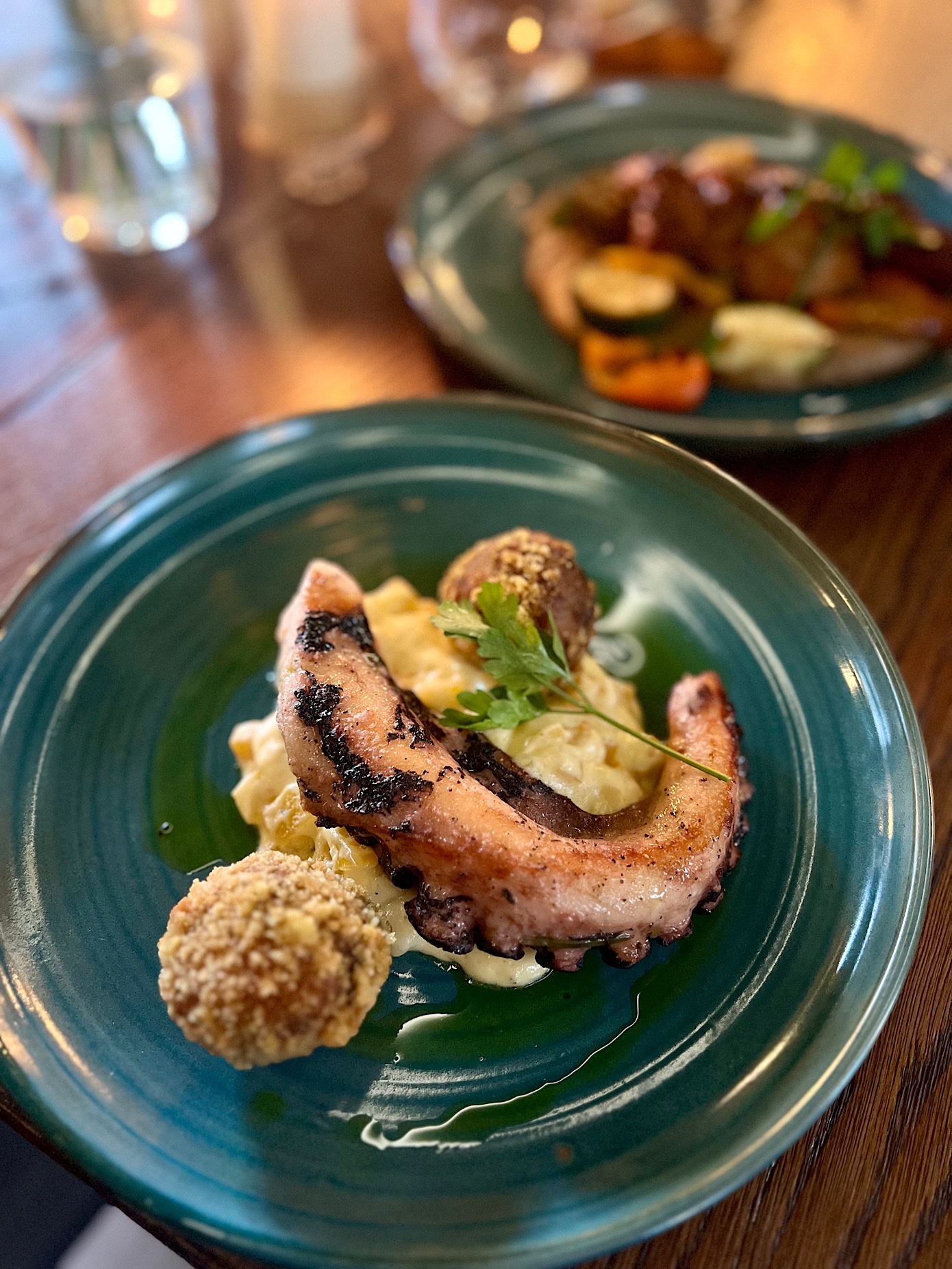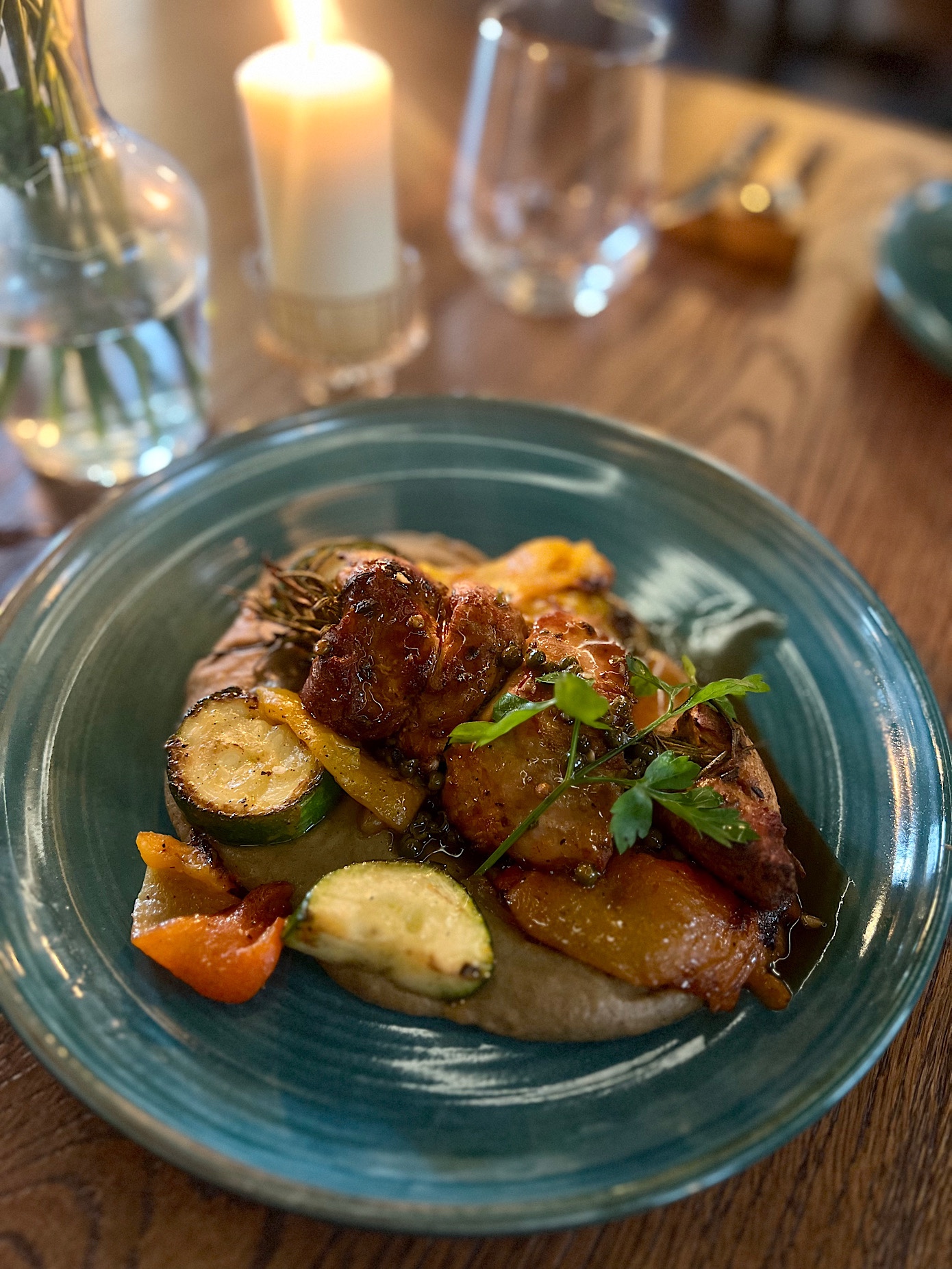 Macka ośmiornicy, arancini, curry, suszone pomidory, dynia, sos beurre blanc (93 PLN), polędwiczki wieprzowe w ziołach, puree z grzybami, papryka pieczona, cukinia, zielony pieprz (63 PLN), wołowina duszona w czerwonym winie, moskole, kapusta czerwona, morela, zielony groszek (83 PLN) oraz comber jagnięcy, gratin szafranowe, burak marynowany, jabłko, pietruszka, rozmaryn (152 PLN).