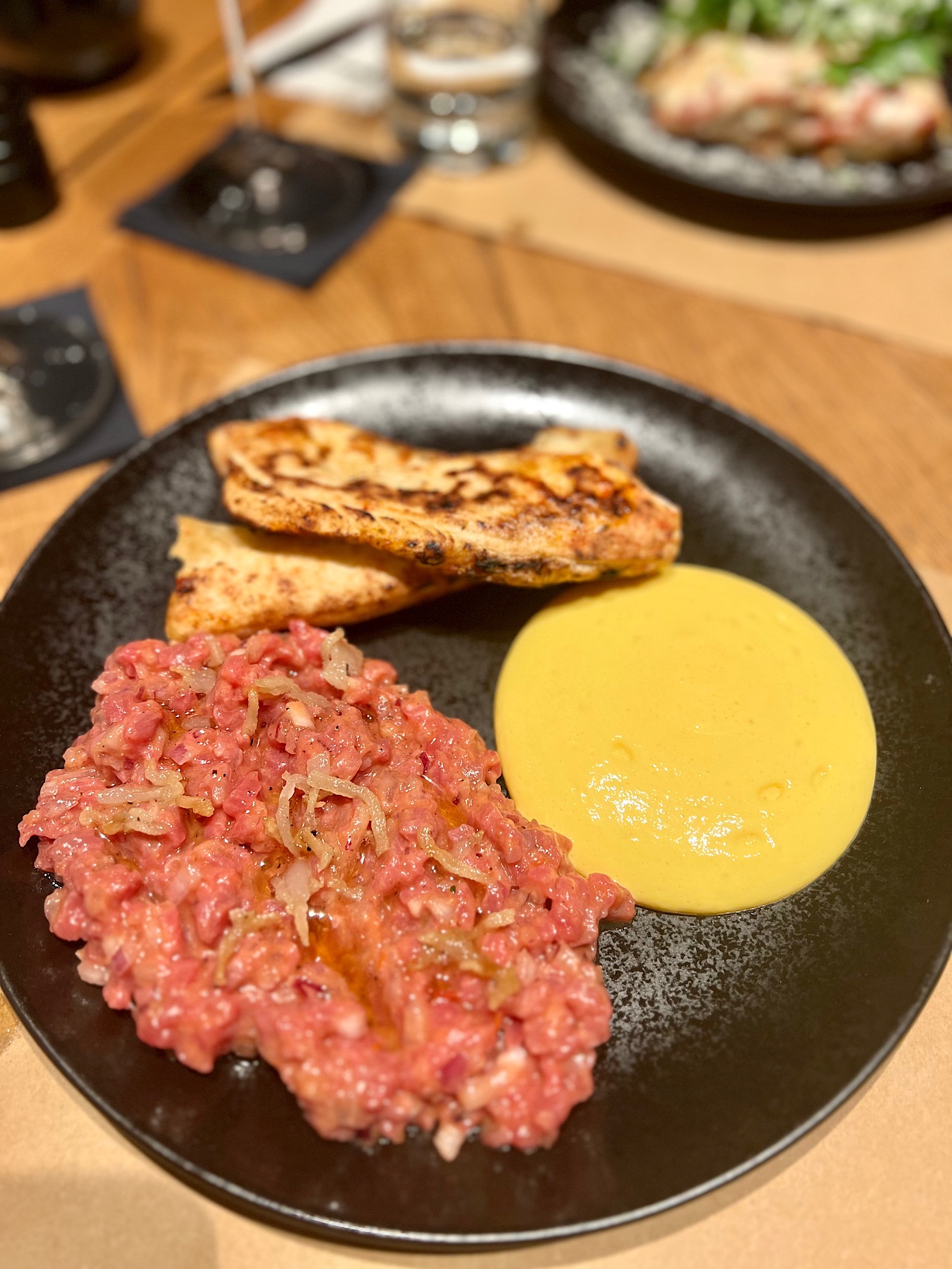 W sierpniu 2023 tatar wołowy (46 PLN) okazał się tożsamy z tym w Nolio. Świetną wołowinę zestawiono ze słodką kalabryjską cebulą z Tropei, sosami Worcester i pomidorowym, zółtkiem w formie pianki oraz parmezanem.