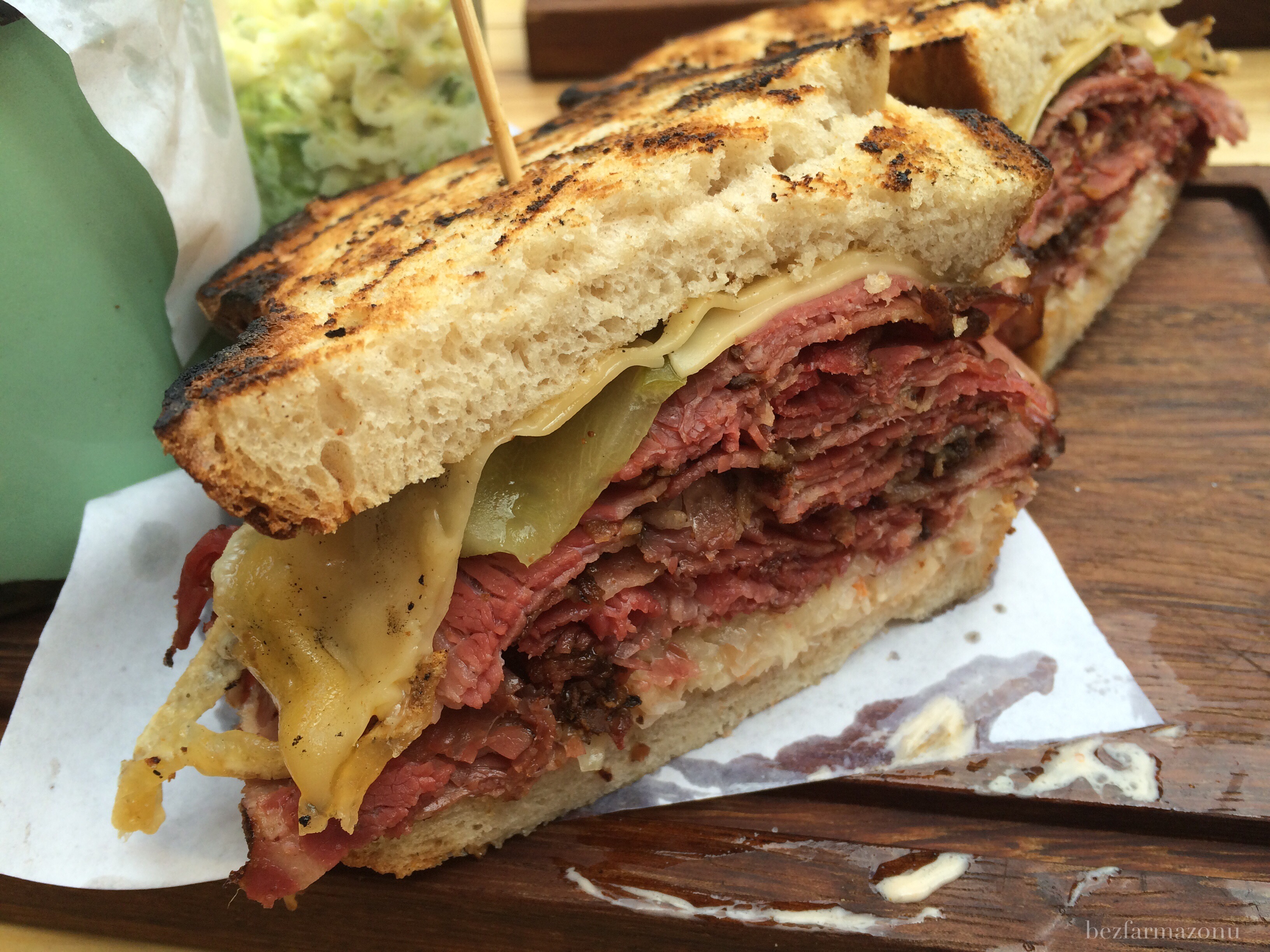Kanapka pastrami super dobra, idealnie przypieczony chrupiący chlebek, sporo porządnie przyprawionej wołowiny przełamanej ogórkami i żółtym serem. Kozak!