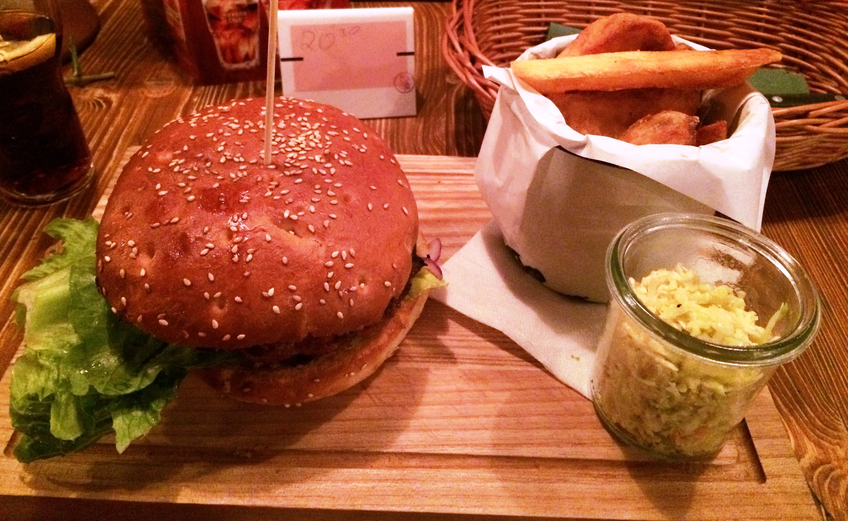 U absolutnie najmilszego kelnera ever zamówiliśmy burgera lubelskiego (45 PLN) którego podaje się w cebularzu. Pomysłowy, ale samo mięso zbyt mocno wysmażone i przez to za suche. Mimo wszystko był zjadliwy, więc nie wrócił na kuchnię.