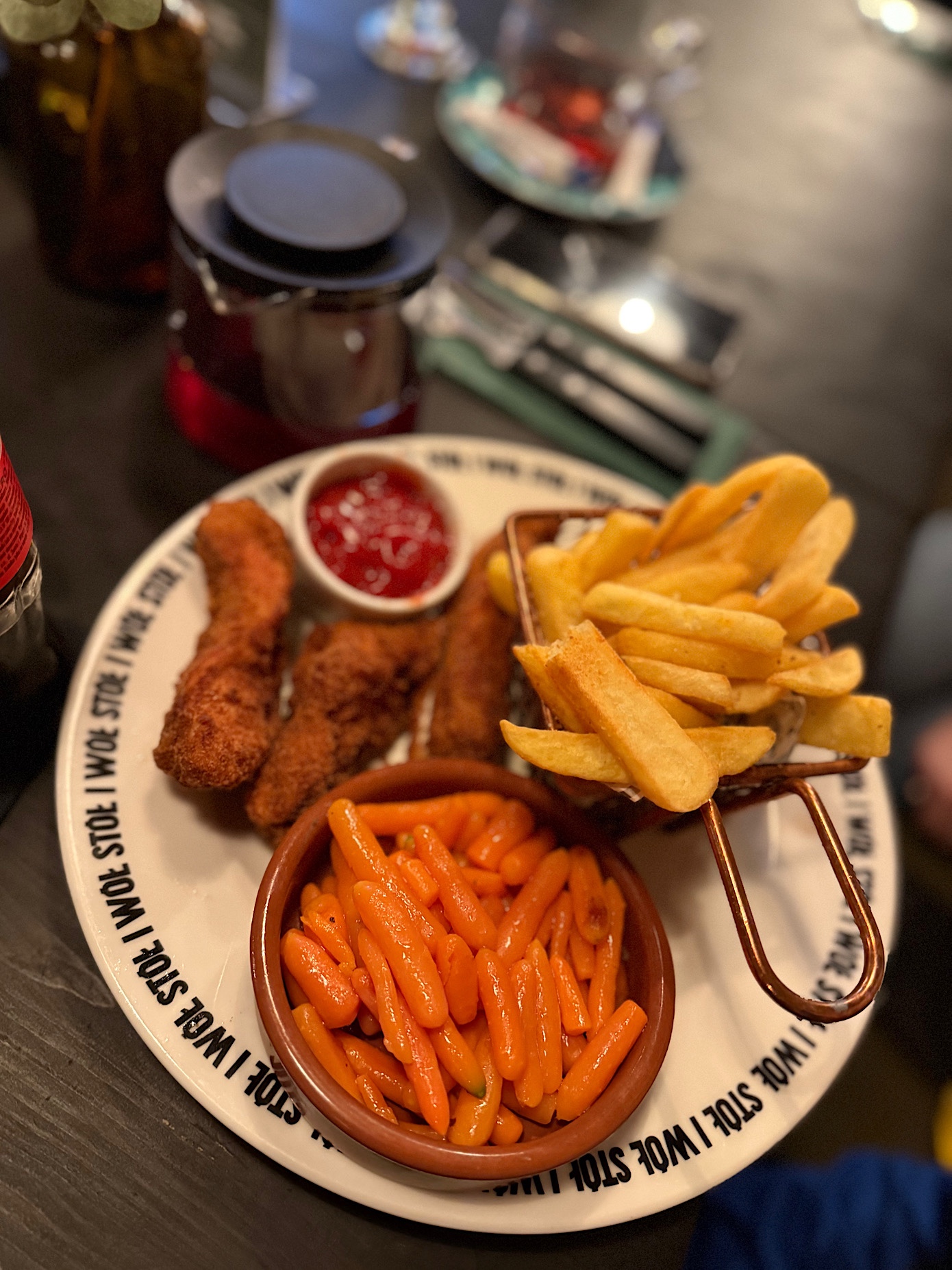 Młodziak z siostrą wciągnęli na spółkę stripsy kuraka z frytkami i marchewkami (29 PLN) i ocenili positiv.