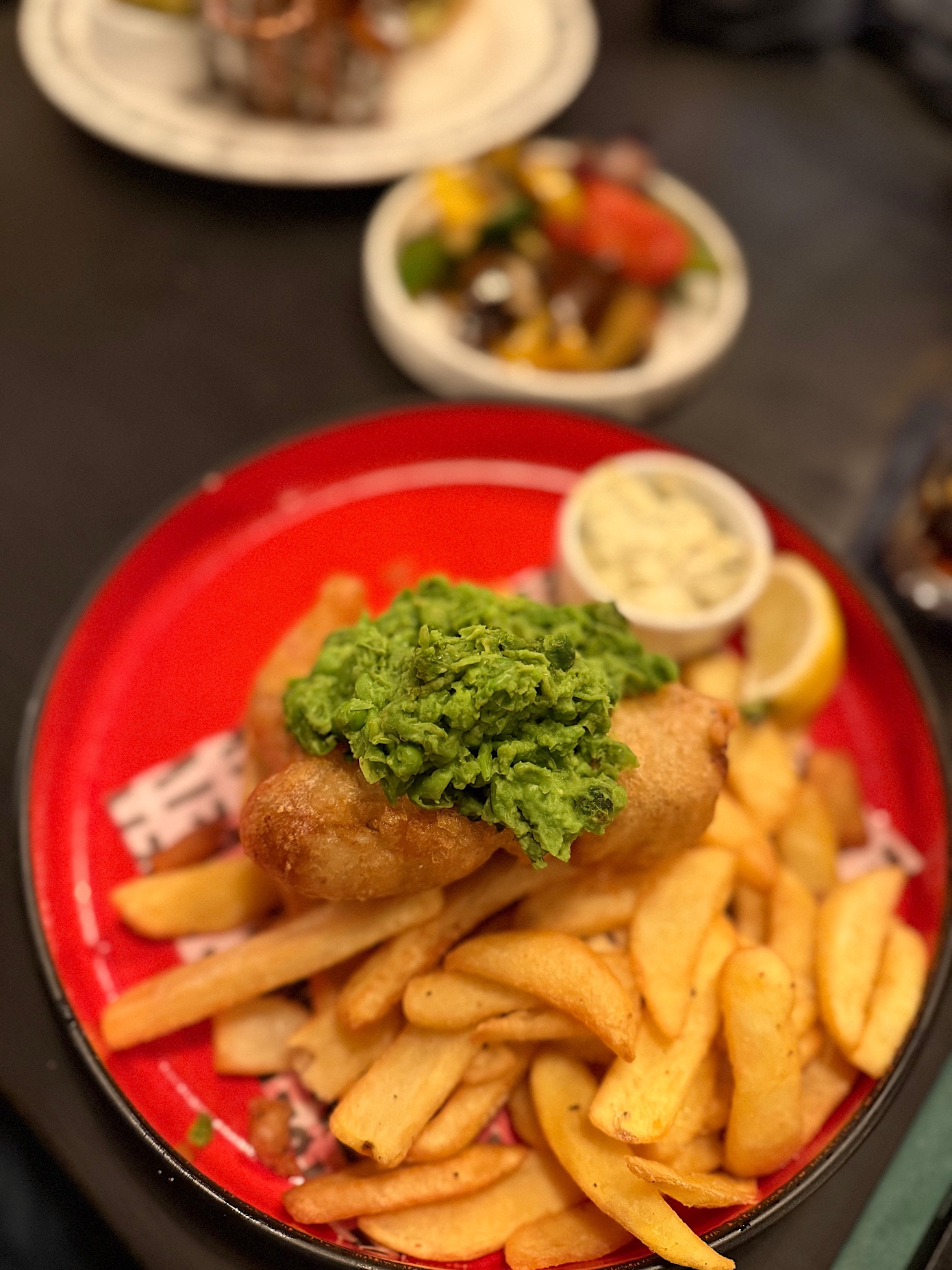 Fish and chips (54 PLN) zaserwowano ze słabym i jałowym groszkowym puree pozbawionym grama soli. Tatarski, ryba w piwnej panierce i frytki w porządeczku.
