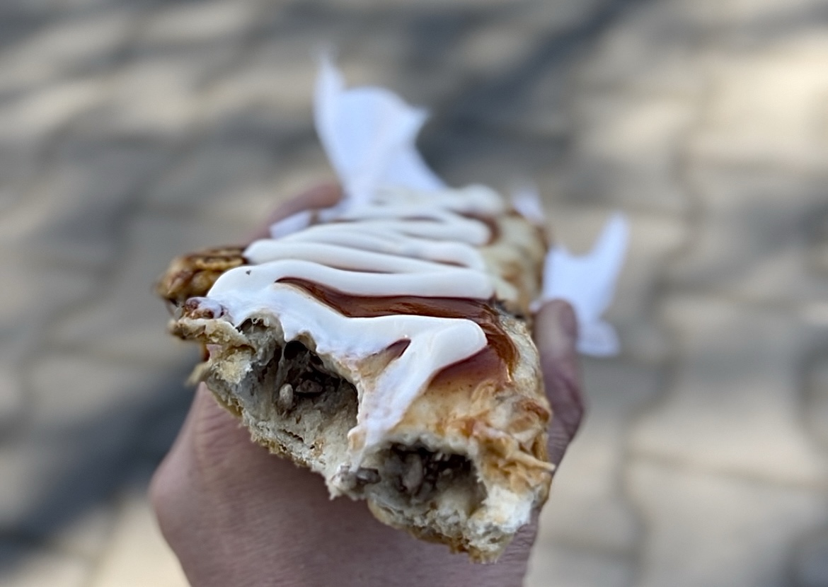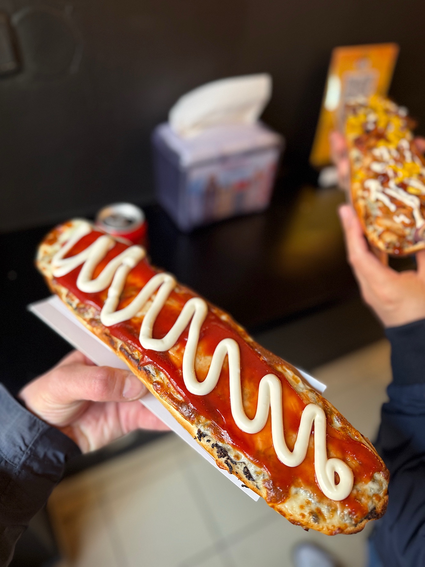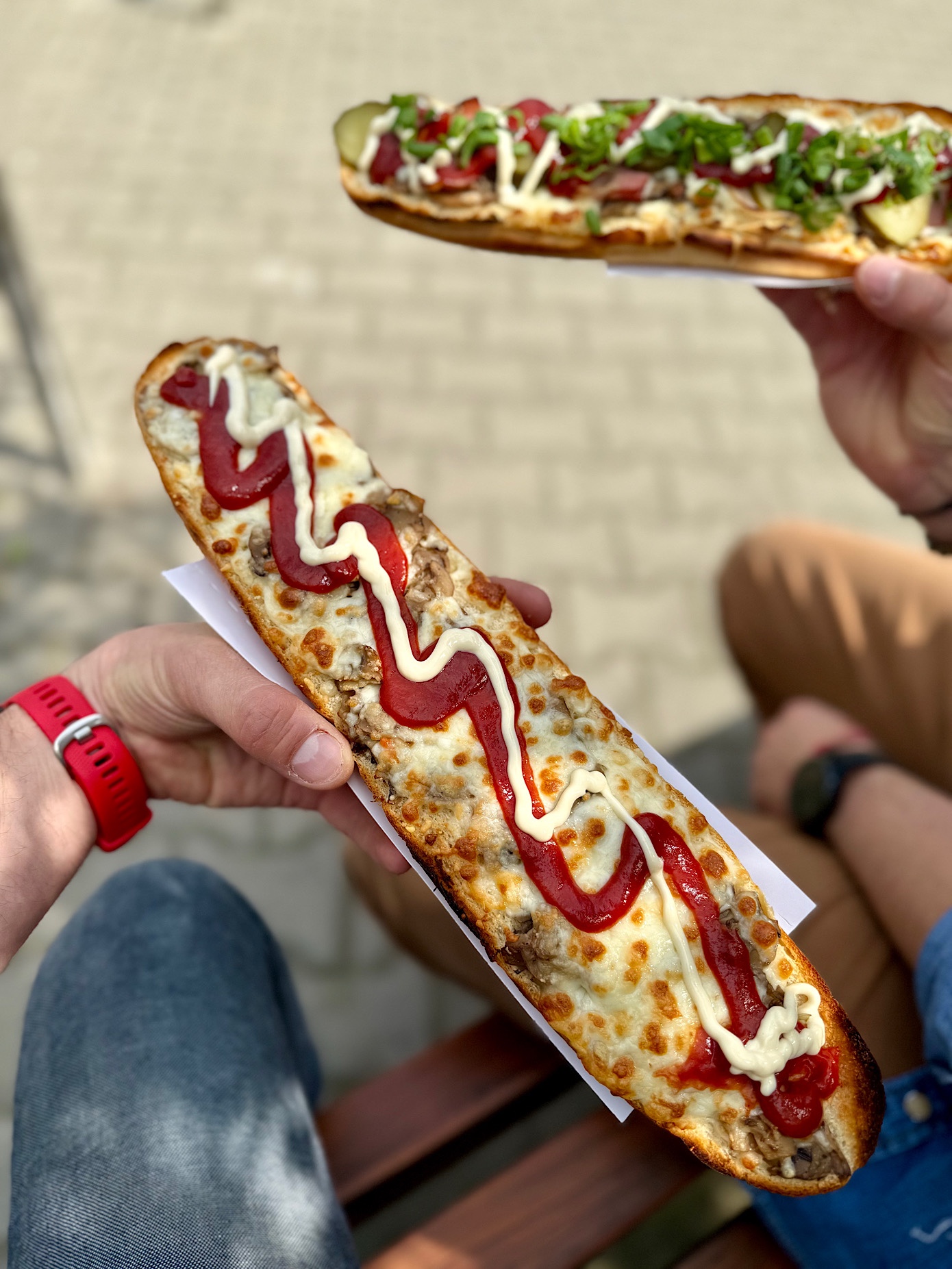 I wiecie co? To szczerze dobre zapiekanki – takie 7,5-8 / 10. Smaczny pieczarkowy farsz z cebulką, dobry, ciągnący się ser, chrupiące na bokach i miękkie w środku pieczywo. Minus? Niedbale polane sosy, ale to jestem akurat w stanie przeżyć.