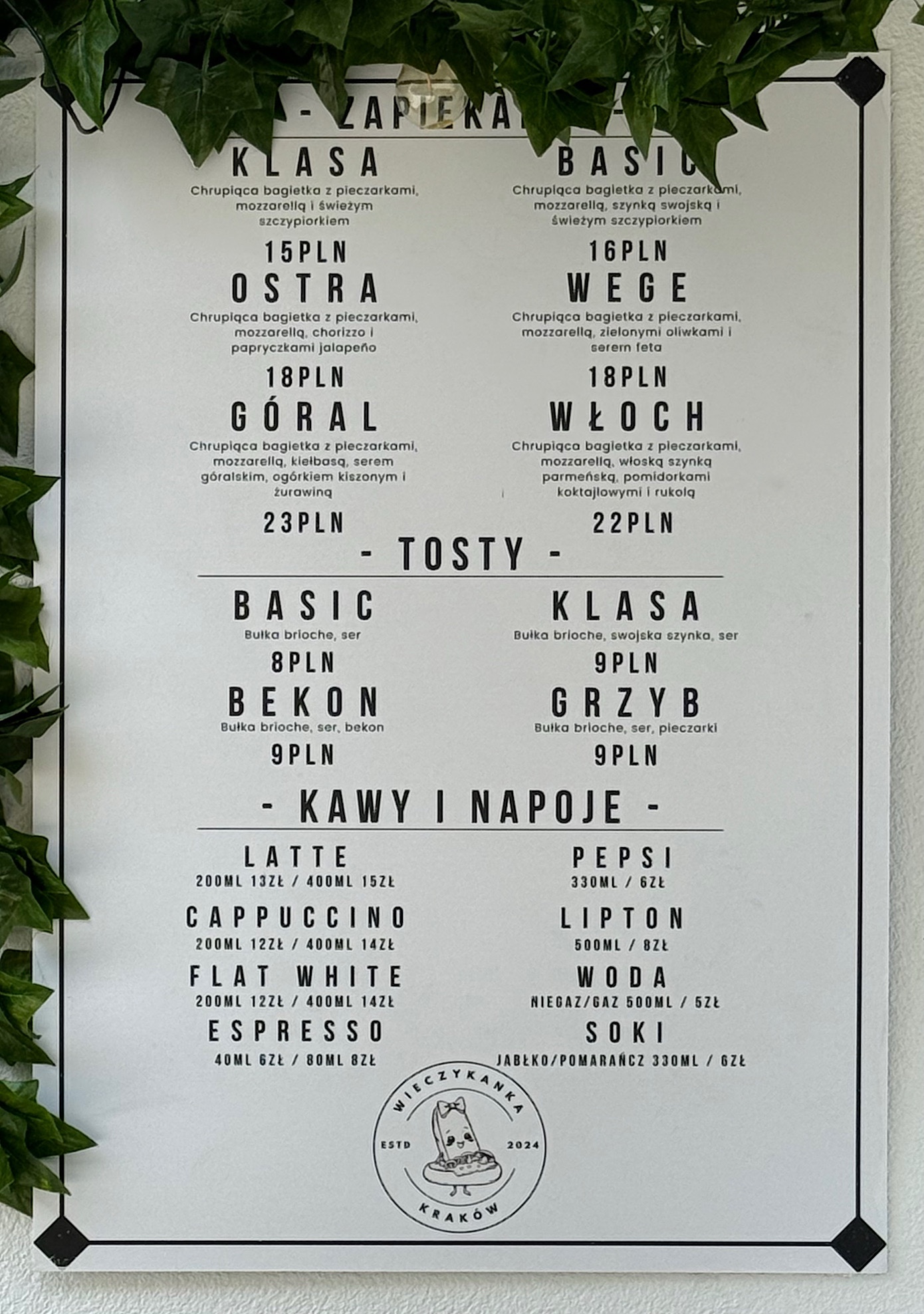 W kwietniu 2o25 poprosiłem o klasyczka z ketchupem i majonezem (15 PLN), a ziomeczek zgarnął bardziej wypasiona wersję z salami, szczypiorkiem i kiszoniakiem (23 PLN).