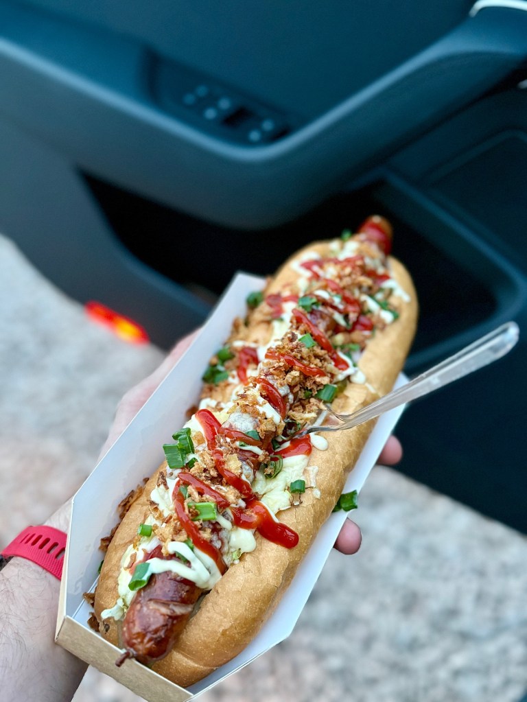 Idealna w konsystencji buła skrywa masę warzywnych surowców w postaci kapuchy, czerwonej cebuli i konserwowego ogóra, a grillowana kiełbaska frywolnym chrupnięciem nakręca konsumpcję.