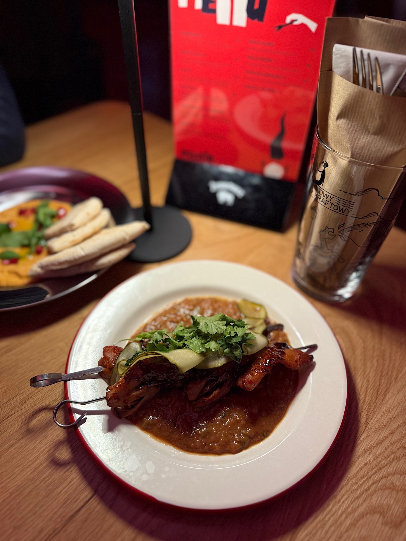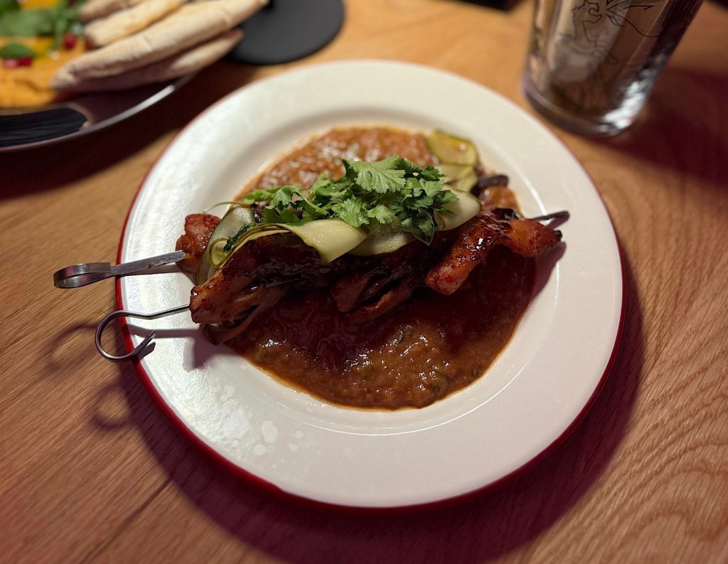 Mięso reprezentowały: kroma hokkaido z szarpaną wołowiną, konfiturą z białej cebuli, pieczarkami i kiszonym ogórkiem (39 PLN) oraz szaszłyki satay z kurzych udek z gochugaru, ogórkami oraz pysznym orzeszkowym sosem (25 PLN).