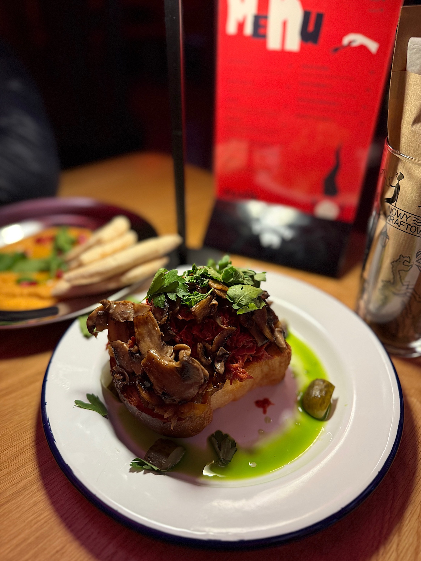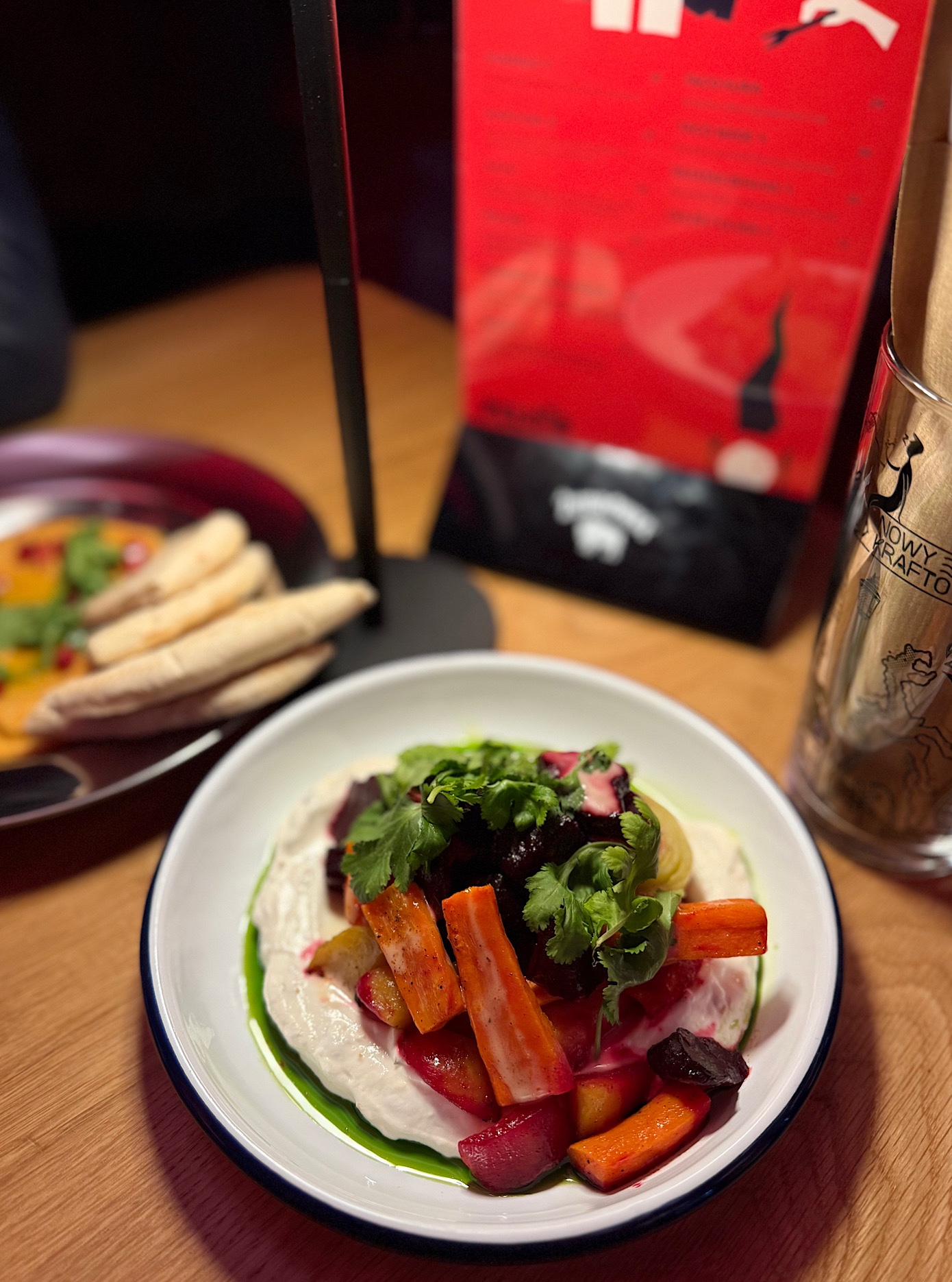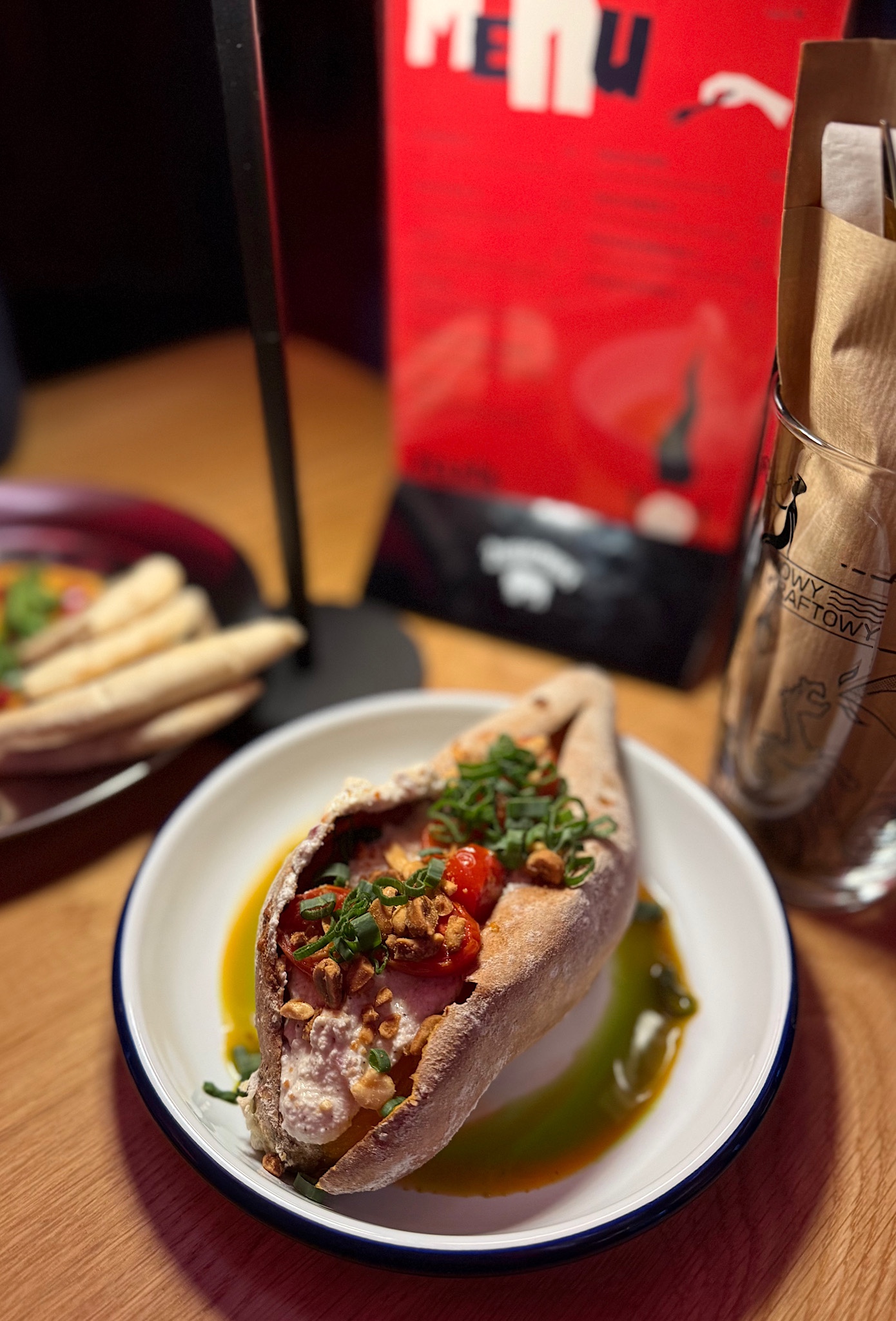 Z pozycji wege skusiliśmy się na hummus z pieczonej papryki z pitą (25 PLN), sezonowe warzywa z wędzonym twarogiem i labnehem (29 PLN), pieczonego batata nafaszerowanego twarogiem, pomidorkami, harrisą, dymką i orzeszkami (28 PLN)