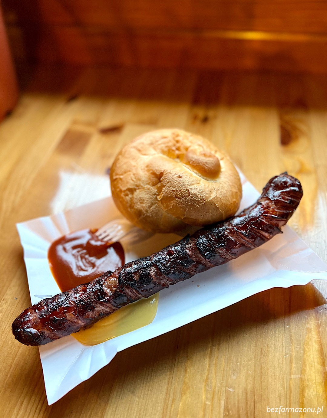 Kiełbasa z ognia z lekko podgrzaną, świetną ślimakową bułką (13 PLN) była najlepszą kiełbą z ognia jaką do tej pory jadłem w Kraku.