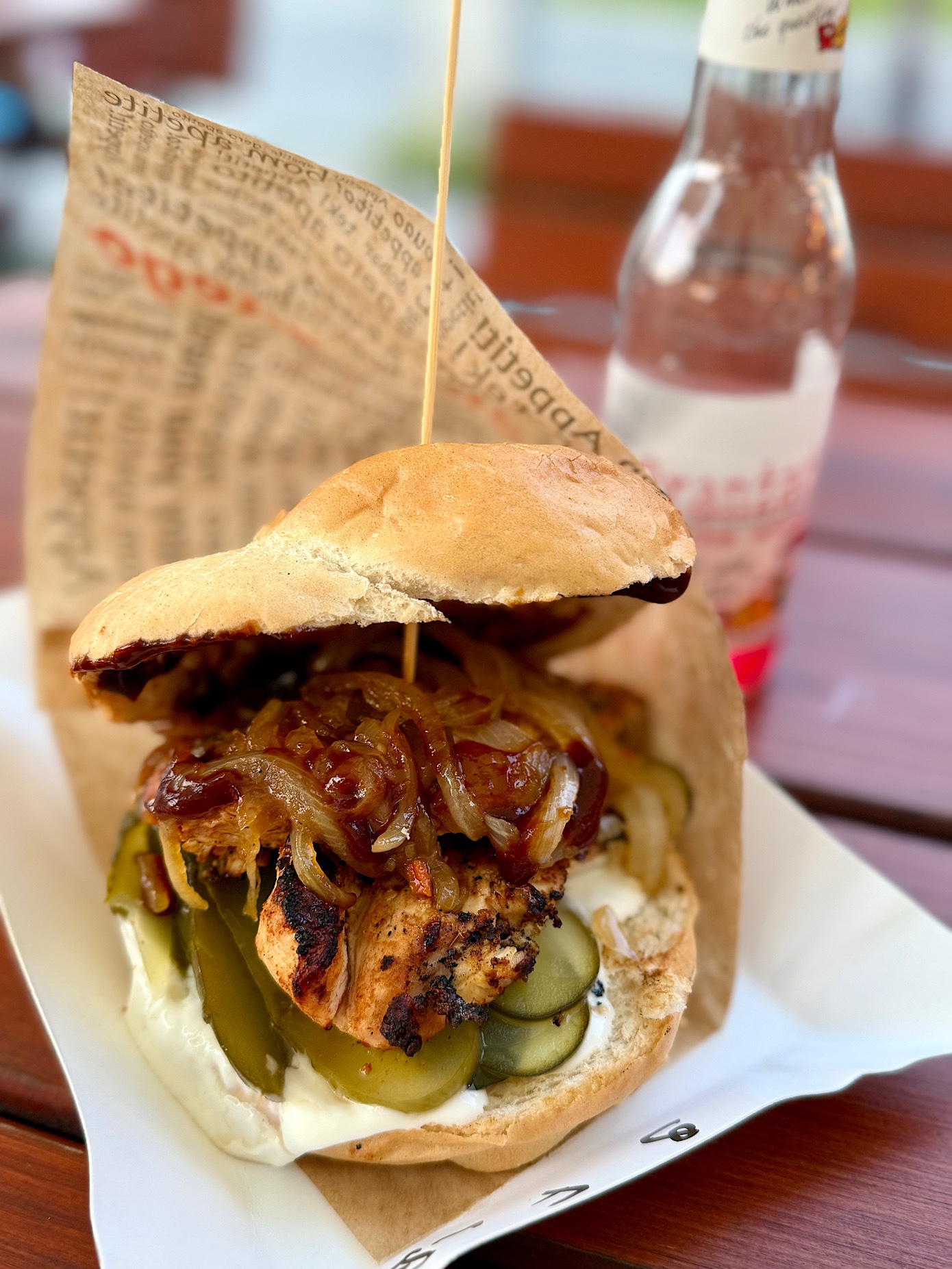 Bugs jak z grilla z domowego ogrodu czy działki. Rubaszna buła, pachnący ogniem i drewnem kotlet (szkoda, że nie medium), frywolne plastry grillowanego boczku, ciągnący się ser, wybitny cebulowy dżem, świeże warzywa na czele z kiszonym ogórkiem.