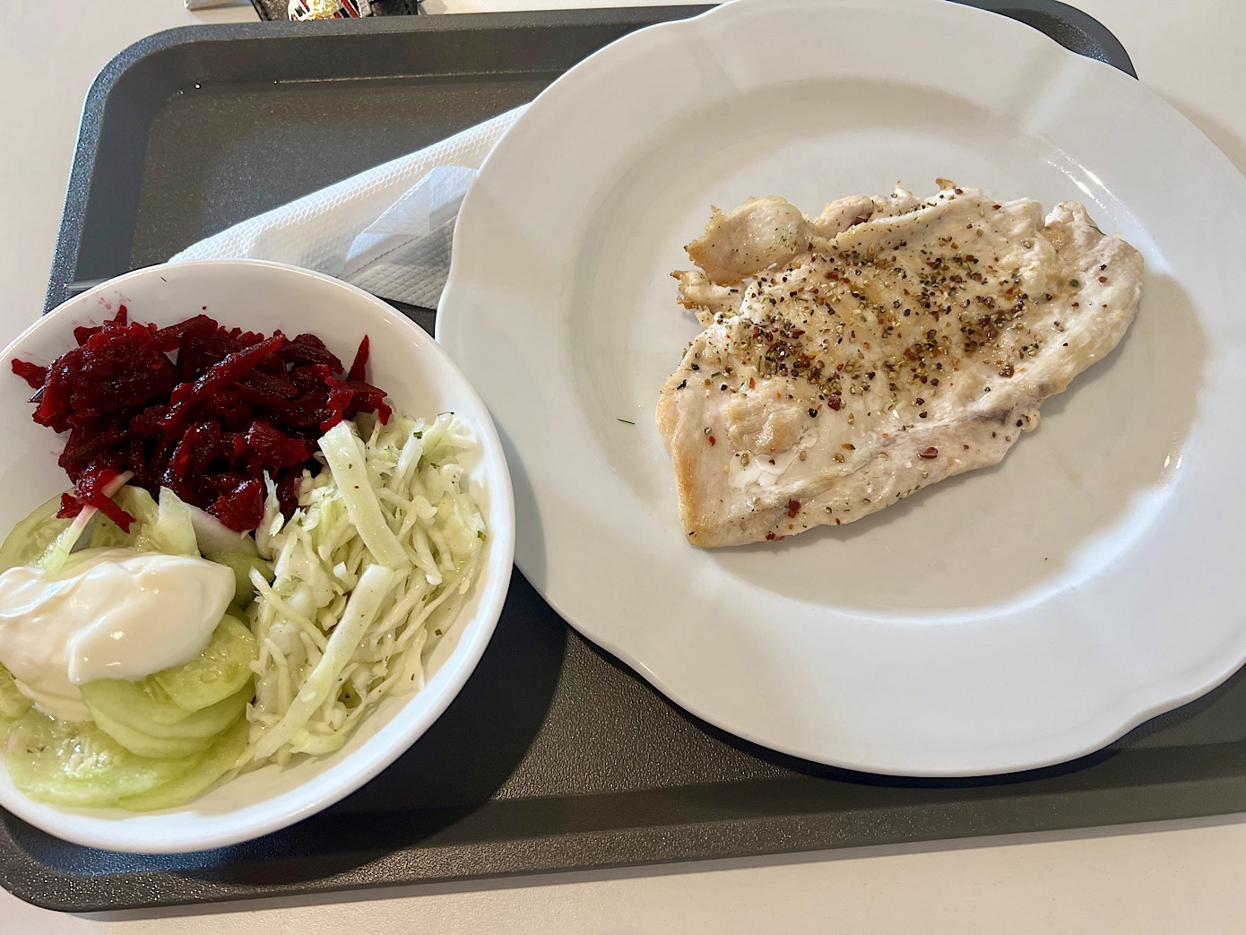 We wrześniu 2024 zapodałem na miejscu soczystą grillowaną pierś z kuraka z zestawem surówek (22 PLN) oraz kilka rodzajów pierogów: z mięsem (18,50 PLN), z borówkami (22 PLN) oraz oczywiście ruskie (17,50).