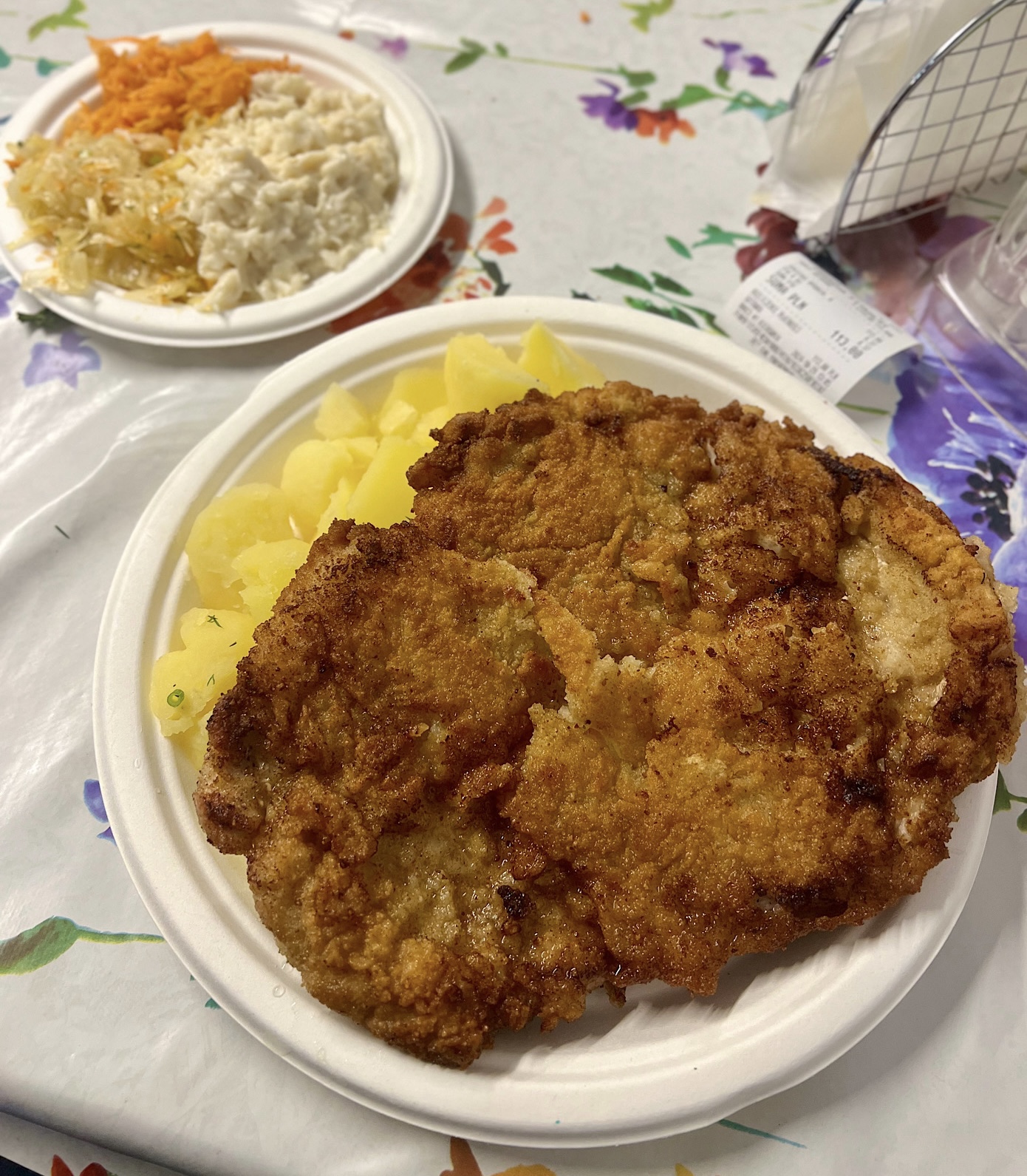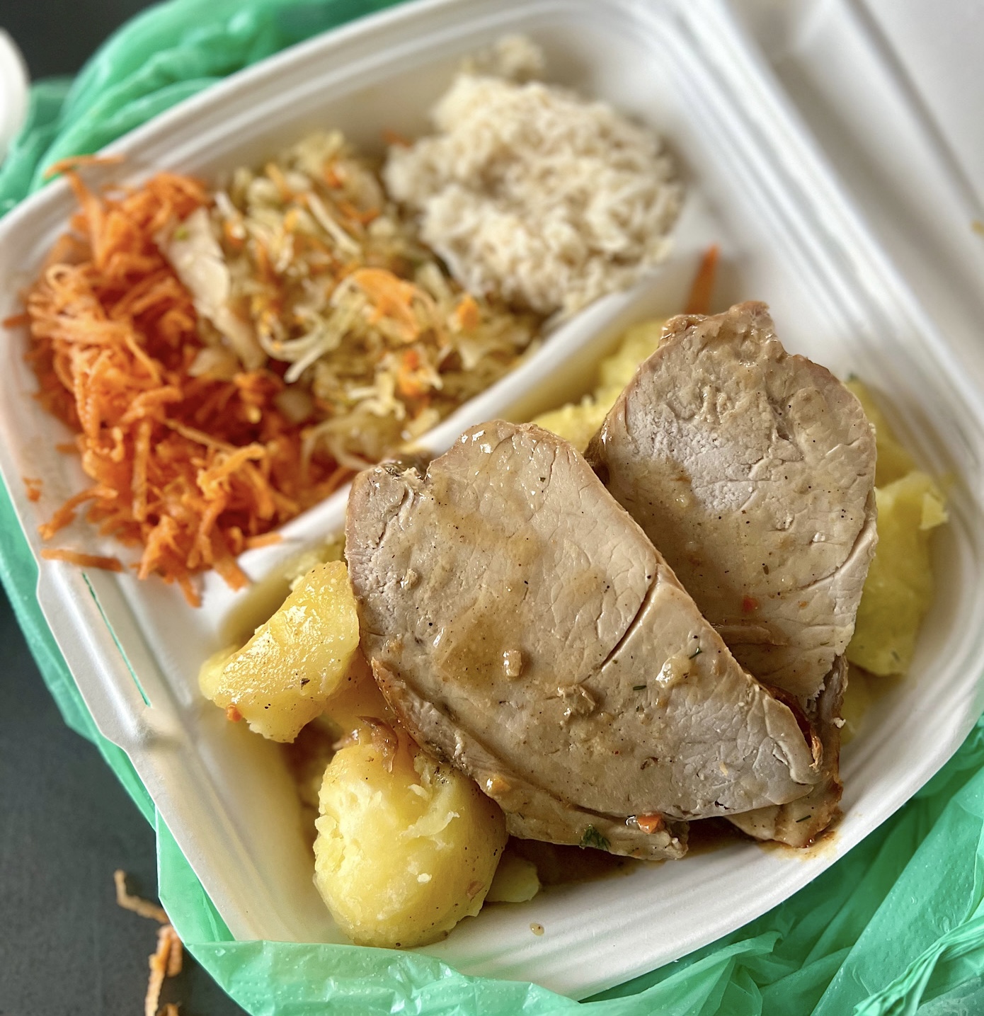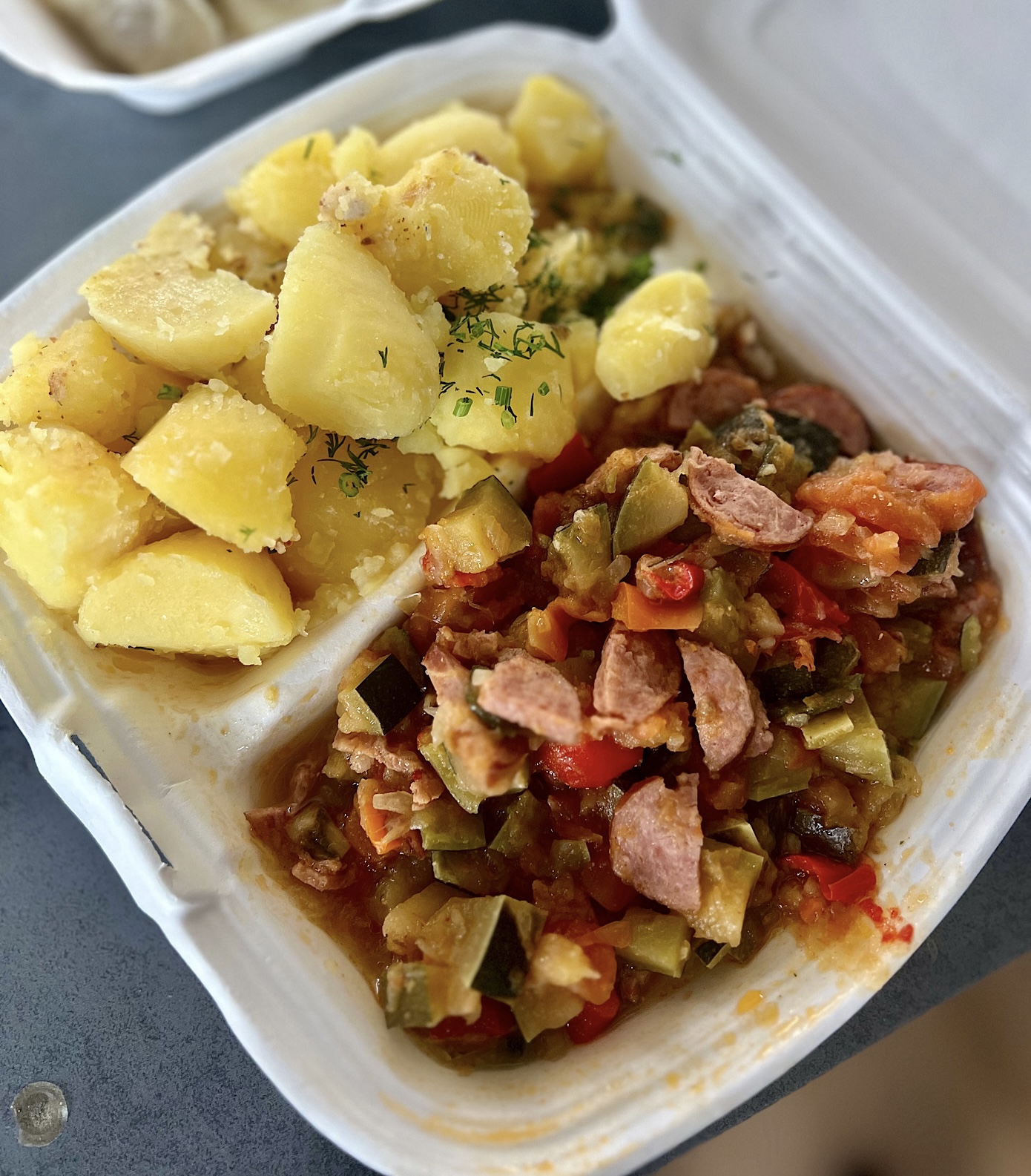 Taki na przykład największy i nagrubszy schabowy ever w październiku 2024 zestawie kosztował tylko 25 PLN, podobnie pieczeń. Lecza z kiełbasą (20 PLN) nie polecam, bo miało strasznie dużo niejadalnych i twardych skórek bakłażana.