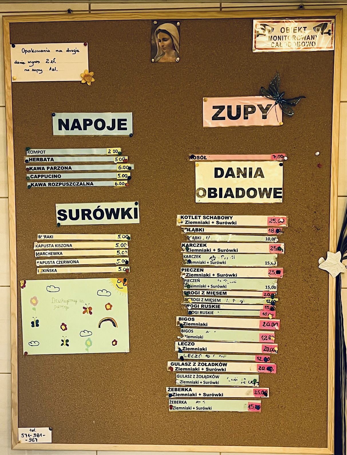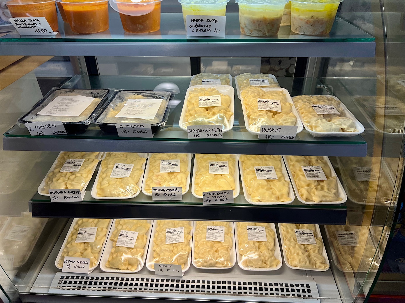 W grudniu 2024 zawitałem na panierowaną pierś kurczaka (17 PLN) z zestawem surówek (5 PLN), a ruskie (12 PLN) i z mięsem (13 PLN) zawinąłem do domu.