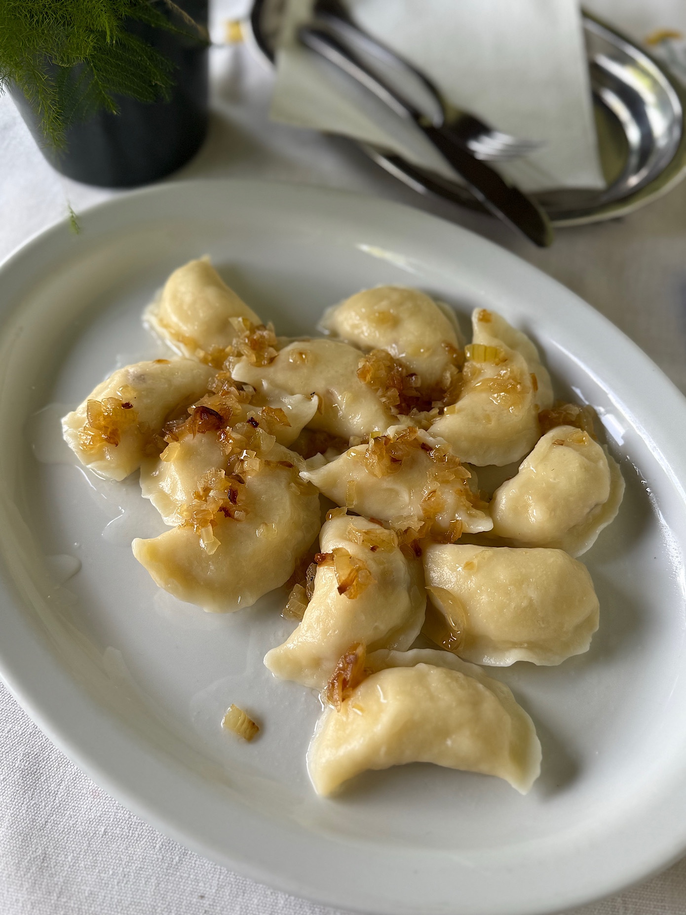Wszyscy mieli rację – pierogi z gospody to majstersztyki! Lekkie ciasto, gruba, doprawiona w punkt treść o wzorowym balansie ziemniaków do twarogu, perfekcyjna cebulka. No cuda!
