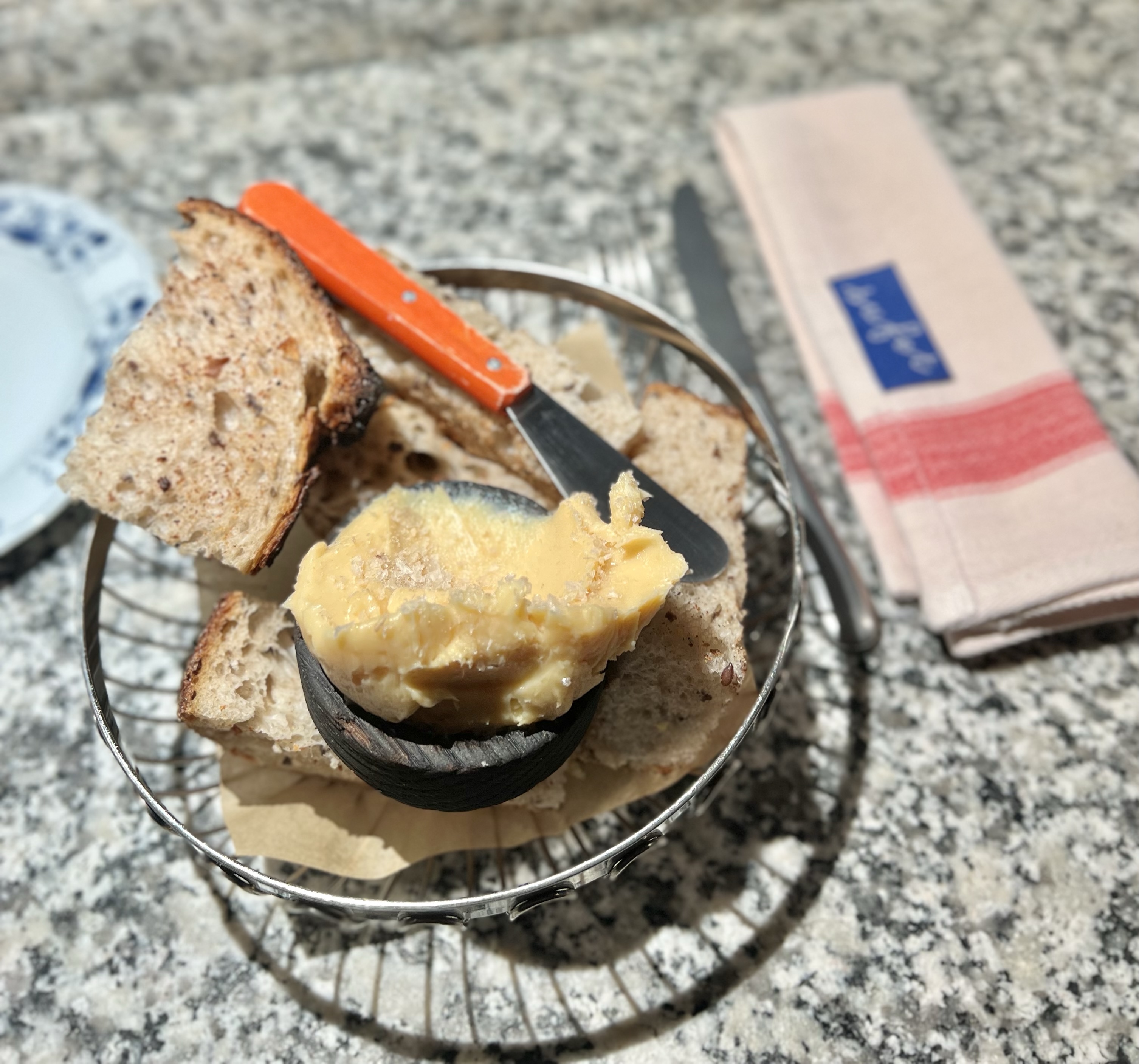 W styczniu 2025 posiedzenie rozpoczęliśmy fenomenalnym pieczywem (takim przez duże F) z masłem drożdżowym. Sześć wybitnych pachnących grubych kromek z chrupiącą skórką za 21 złotych.