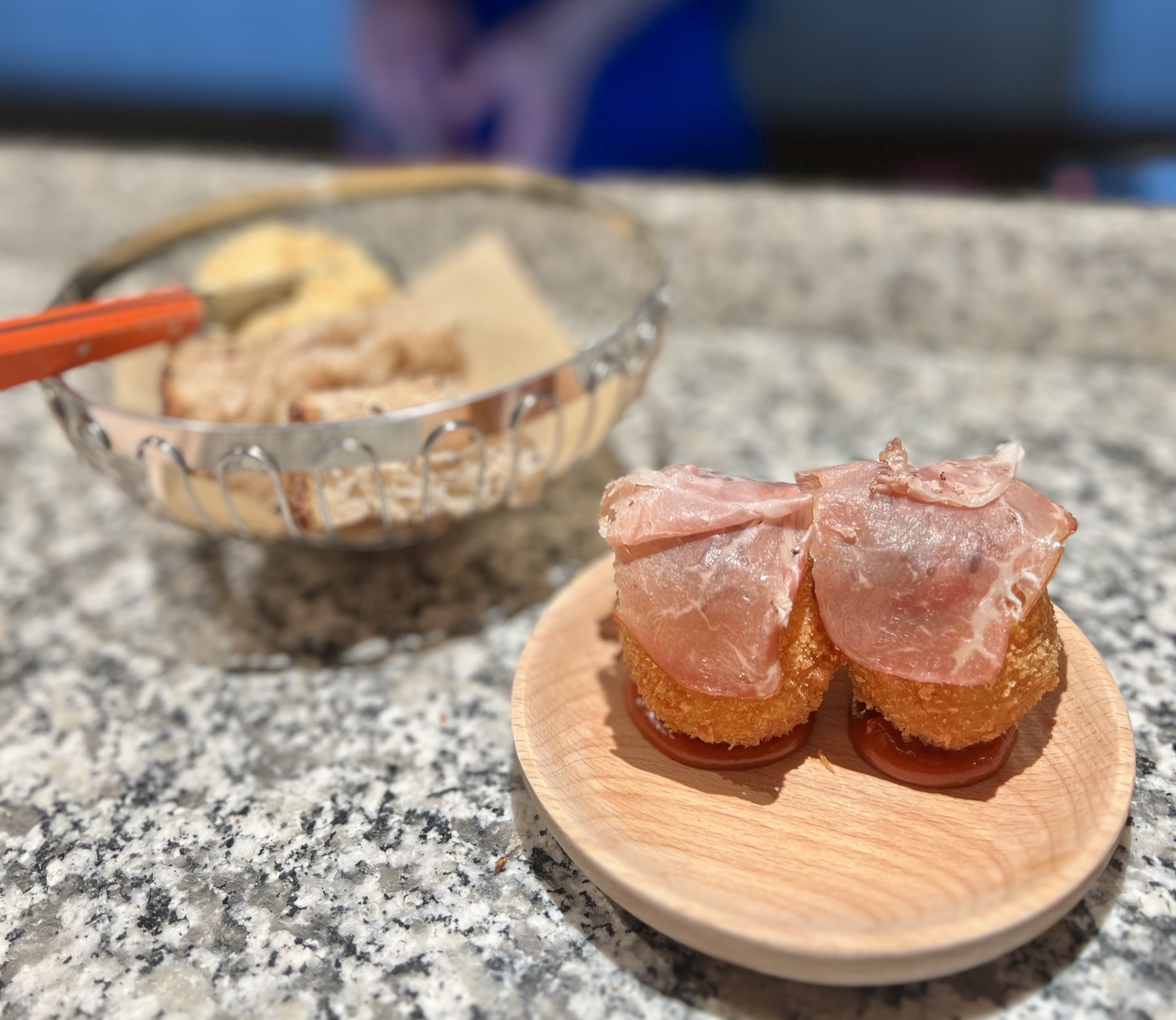 Po krótkiej chwili degustowaliśmy krokiety z policzkiem z kandyzowaną kiszoną kapustą na ketchupie barbecue (26 PLN) i szczerze kompletnie nas nie porwały. Nic się w nich nie działo. Zero gierek. Kurcze, wiało nudą!