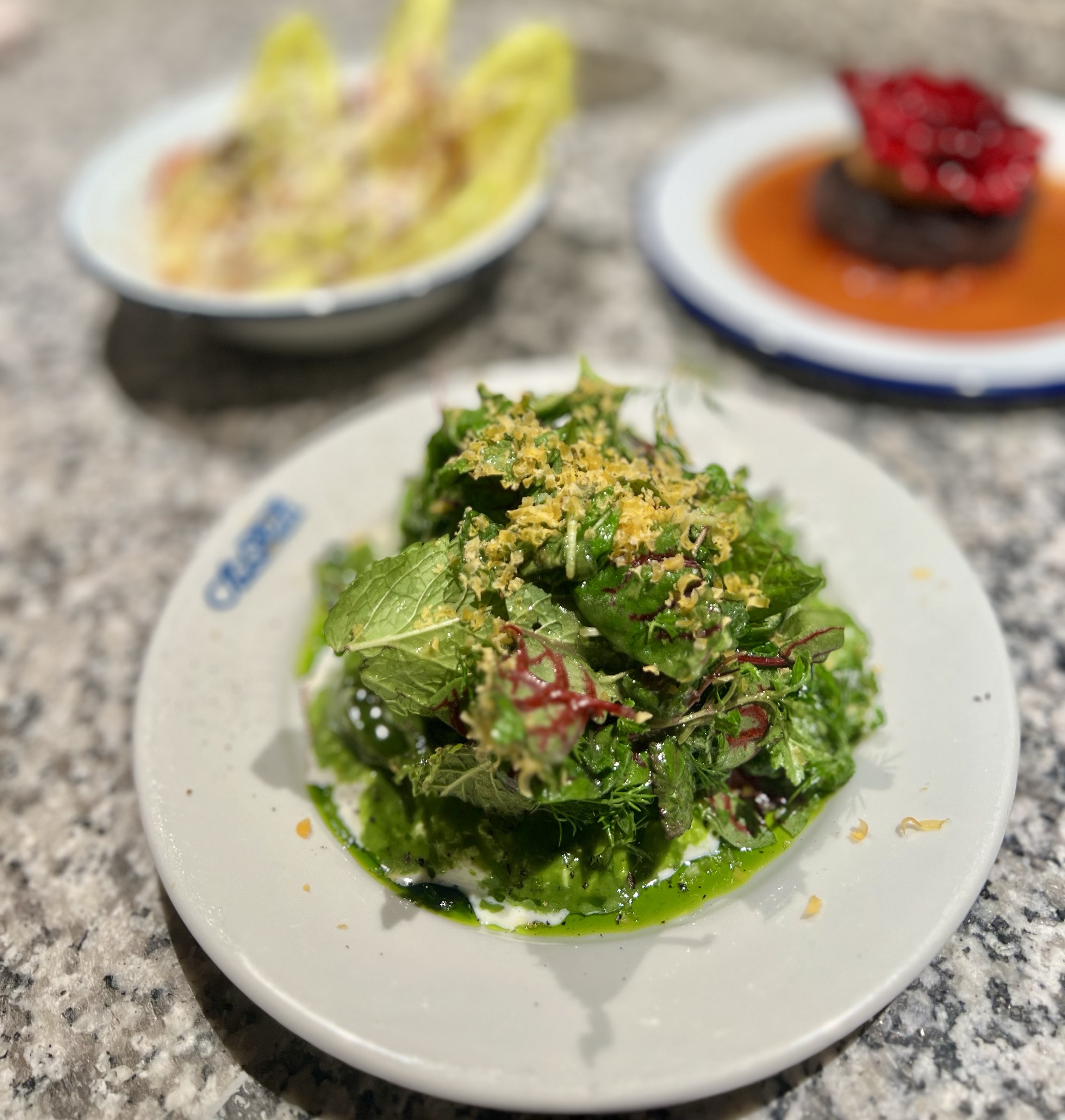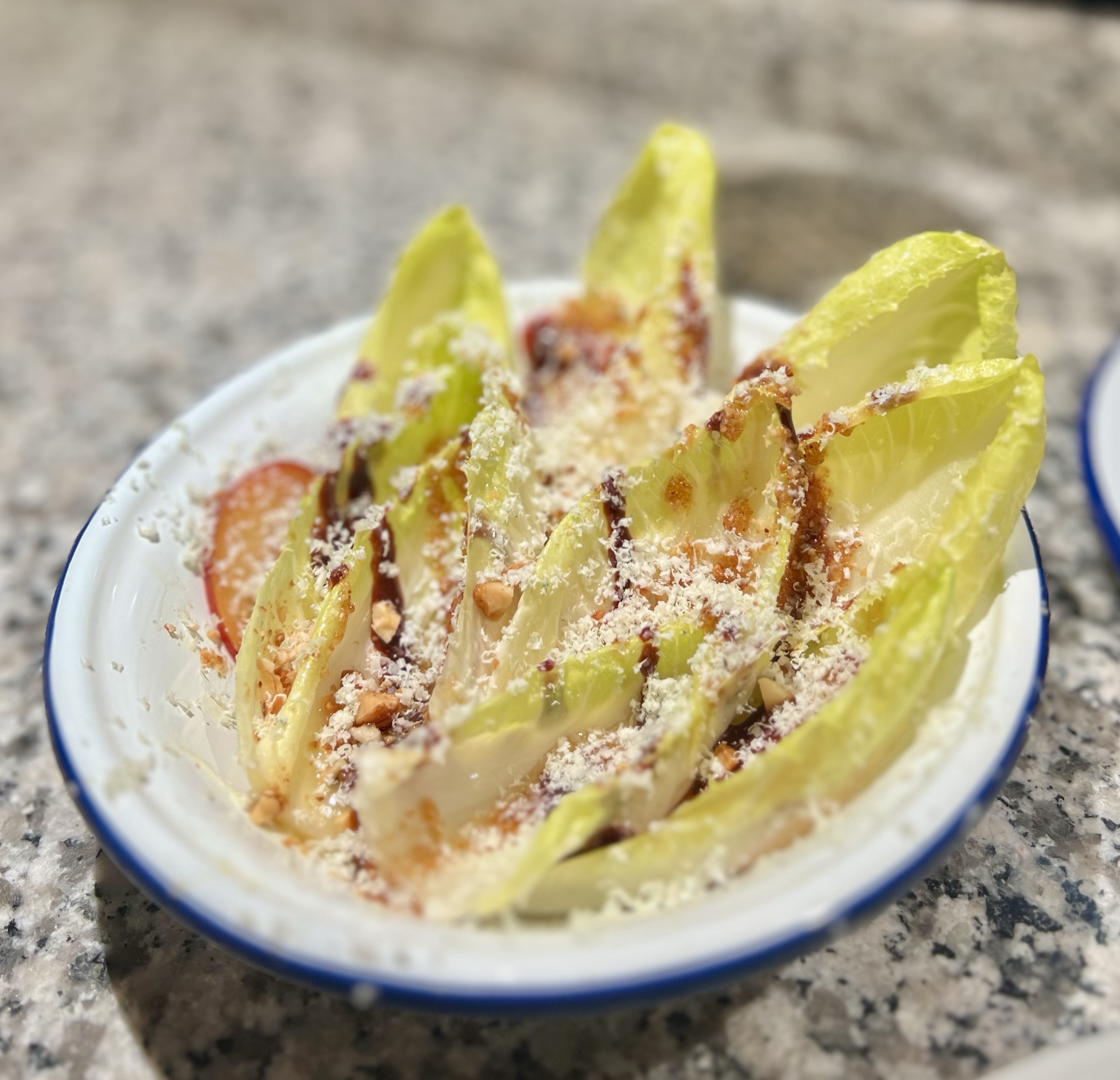 Za koleją pojawiły się rześkie grillowane i marynowane ogórki ze straciatellą, ziołami i olejem koperkowym (34 PLN) oraz liście cykorii z orzechami, serem Jura Bleu oraz śliwką.