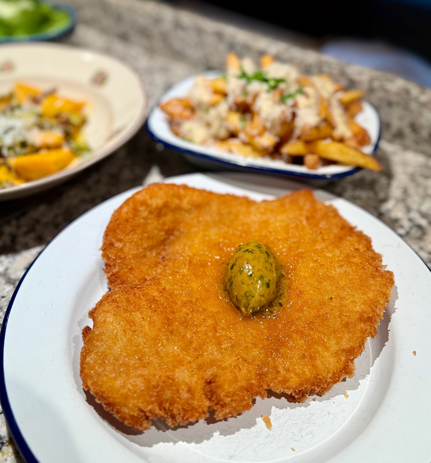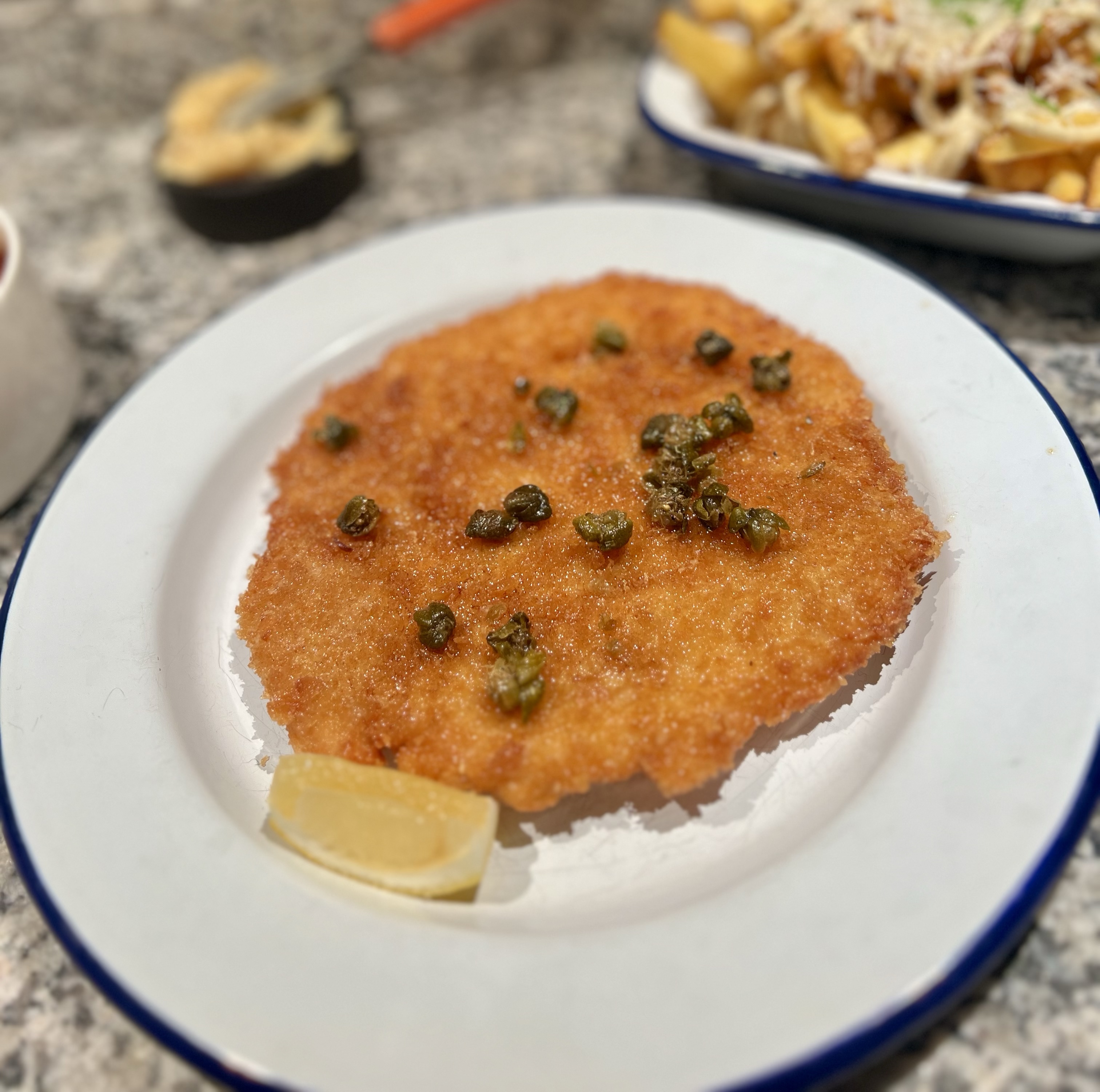 Mojej uwadze nie mógł ujść sznycel z wieprzowiny rasy Duroc w towarzystwie smażonych kaparów. Soczysty, intensywny i dosłownie kipiący palonym masłem (49 PLN). Czy był to jeden z lepszych schabowych ever? Owszem. Czy najmniejszy? Również owszem…
