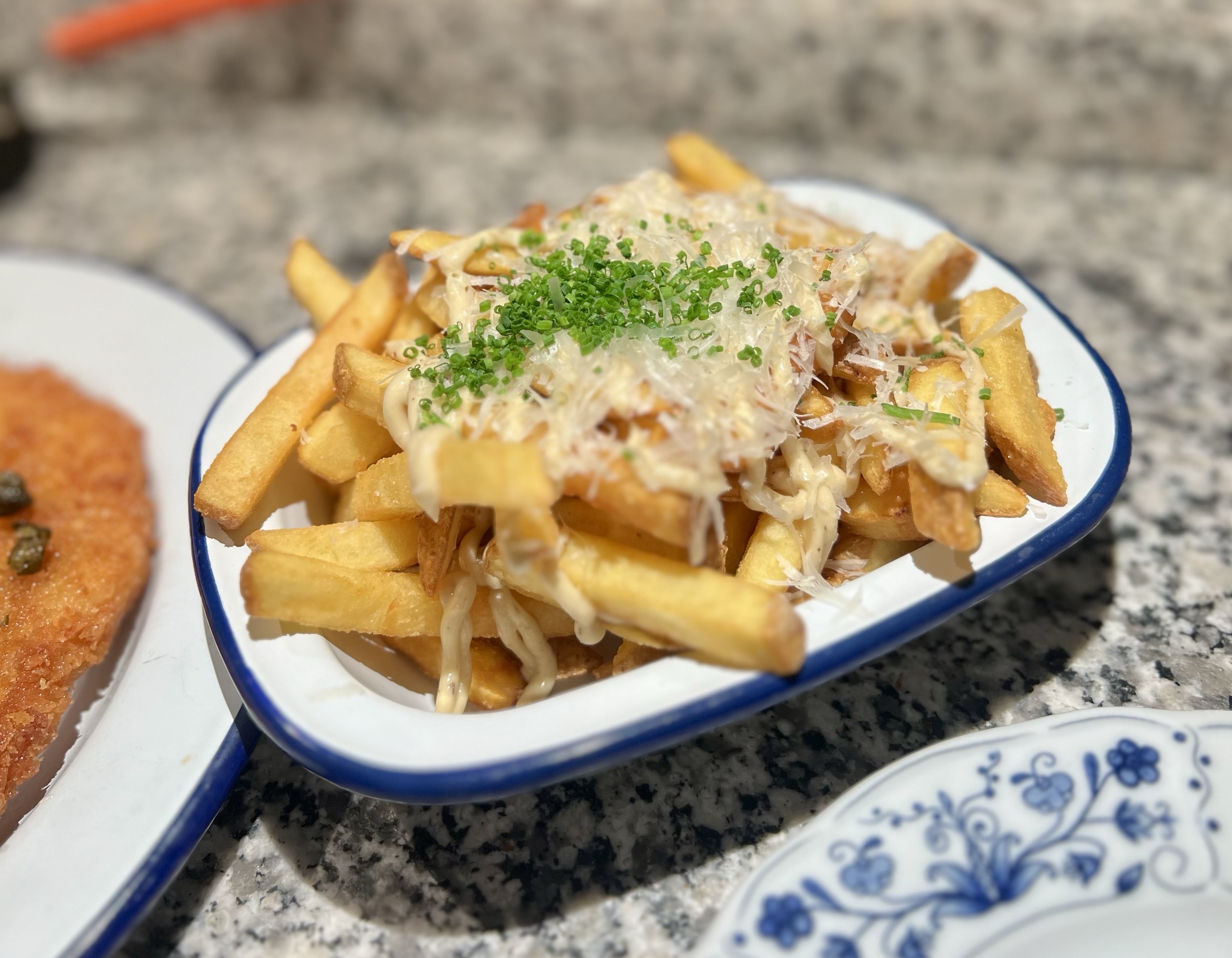 Śwince akompaniowały frytki z oklepanym majonezem truflowym i serem Emilgrana (21 PLN). Smaczne, ale nic do życia nie wniosą – szkoda marnować miejsce w żołądku.