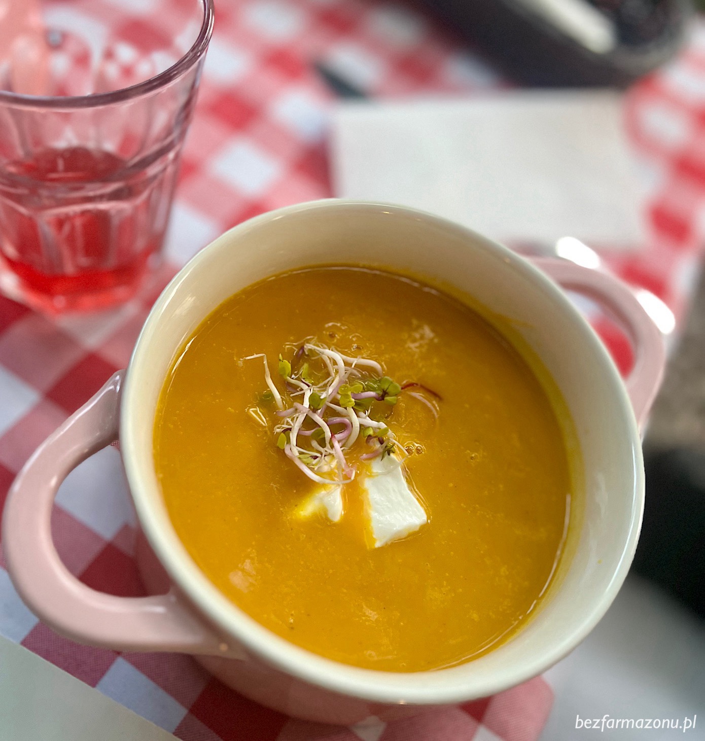 Postawiliśmy na klasykę – bardzo delikatny i gorący! rosół z makaronem (12 PLN), a także coś z sezonowej, jesiennej wkładki – gęsty krem z dyni (19 PLN) podany z keksem śmietany. Obie pozycje uznaliśmy za smaczne i jak najbardziej do powtórzenia w przyszłości.
