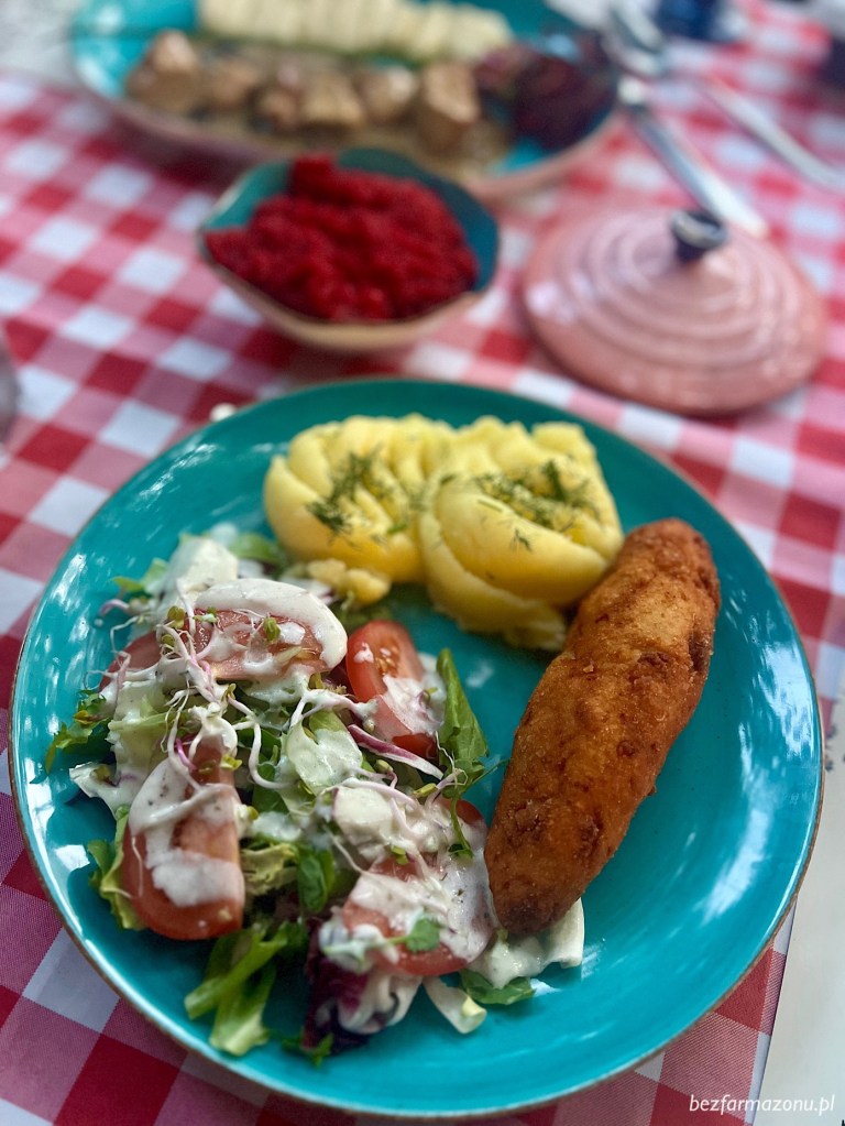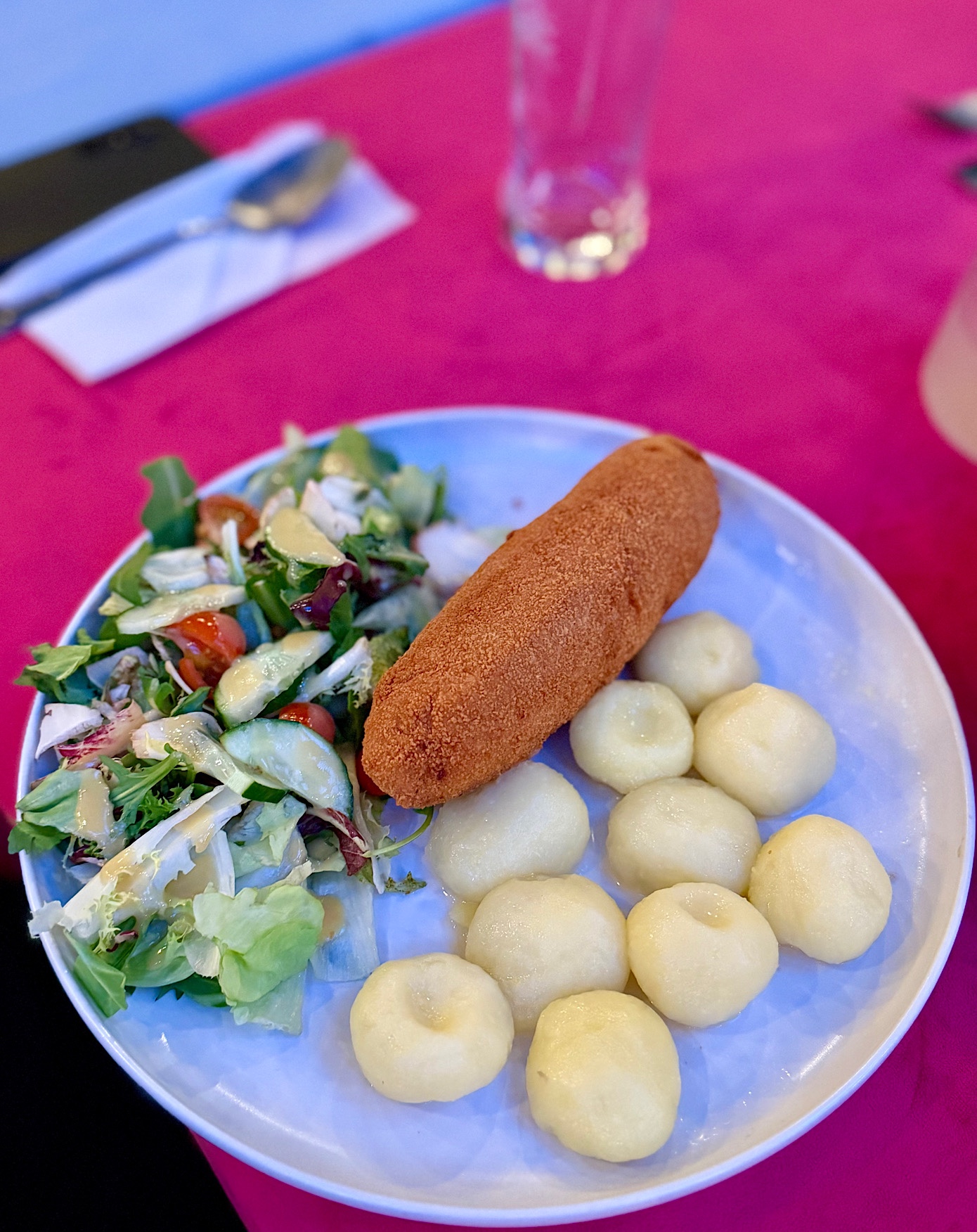 Dla siebie wybrałem kotlet de volaille z ziemniakami i bukietem surówek (38 PLN). W mięsie brakowało mi większej ilości wypływającego masła po przekrojeniu, natomiast było ono wyraźnie wyczuwalne w kremowym puree. Bukiet surówek, okazał się mixem sałat i pokrojonym pomidorem polanym sosem, nie był owy bukiet zły, acz do końca mi pasował do tegoż kotleta. Zastąpiłbym go klasyczną opcją z tartej marchewki, czy poszatkowanej kapusty.