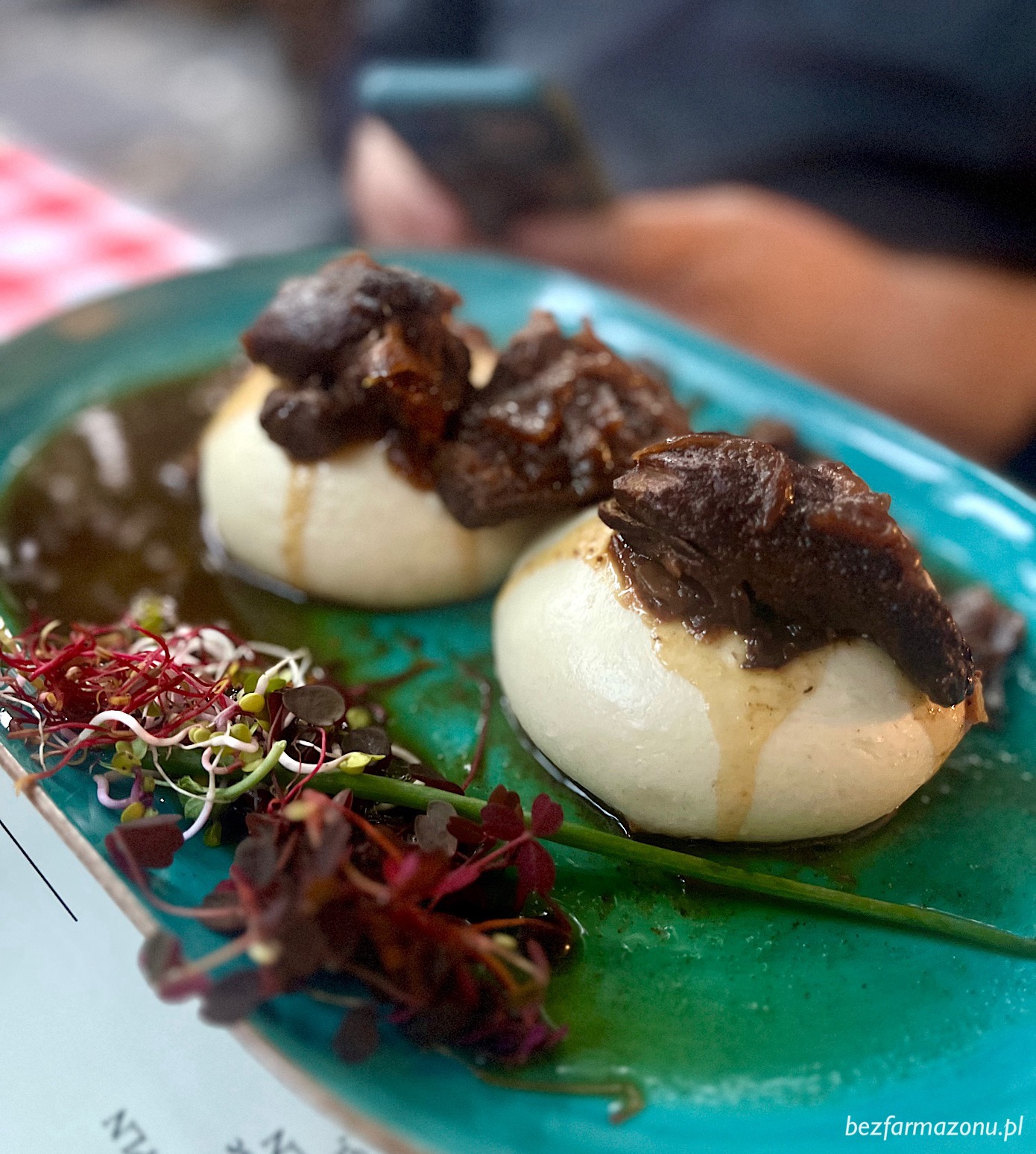 B. postawił na maczankę krakowską podaną na pampuchach w zestawie z kiszonymi ogórkami (47 PLN). Parowane bułeczki były mięciutkie, tak samo jak i mięso. Na wyróżnienie zasługują wyjątkowo smaczne, kwaśne i chrupiące ogórki.