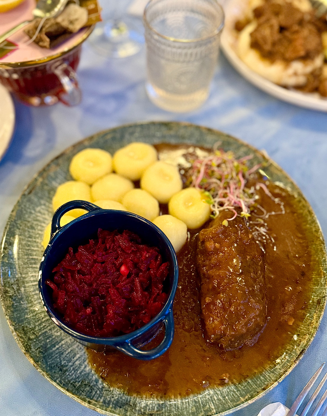 Połówka zdecydowała się na kolejną pozycję z jesiennego menu – polędwiczkę wieprzową w sosie z leśnych grzybów z kopytkami i burakami na ciepło (47 PLN). Cena wysoka, ale smakowo w szkolnej skali szóstka – kopytka smaczne jak u mamy, mięso chudziutkie, sos pełen aromatu. No i te maślane buraki… Rozbiły bank!