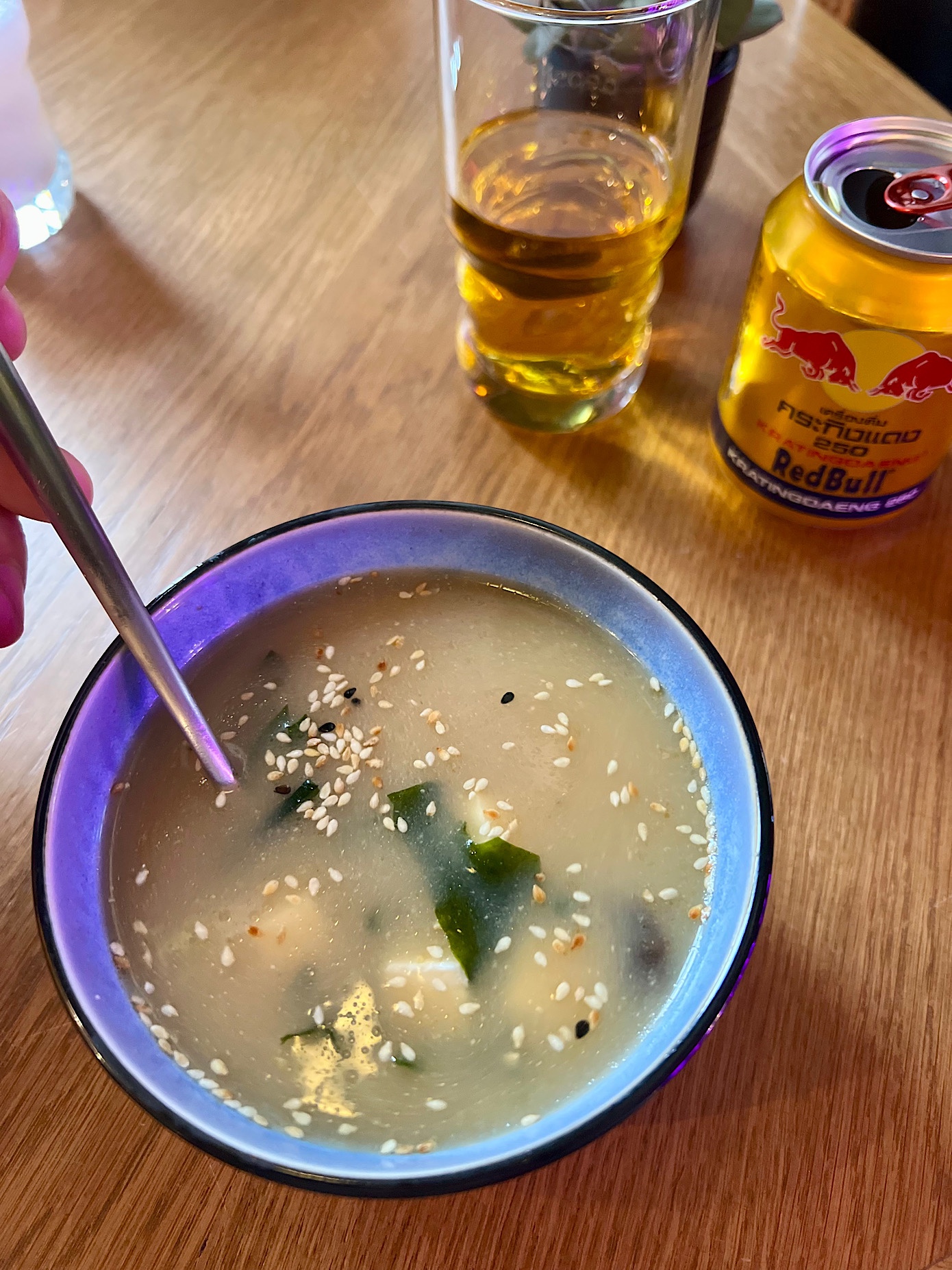 Zupa miso jest okey i należy zauważyć, że miska jest sowicie wypełniona tofu, grzybkami i wakame (22 PLN).