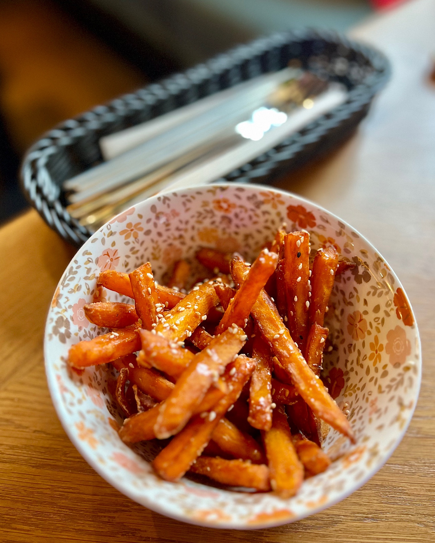 W kwietniu 2025 ich frytki z batatów (19 PLN) za sprawą posypania sezamem i polania miodem zaskakują i powodują uśmiech.