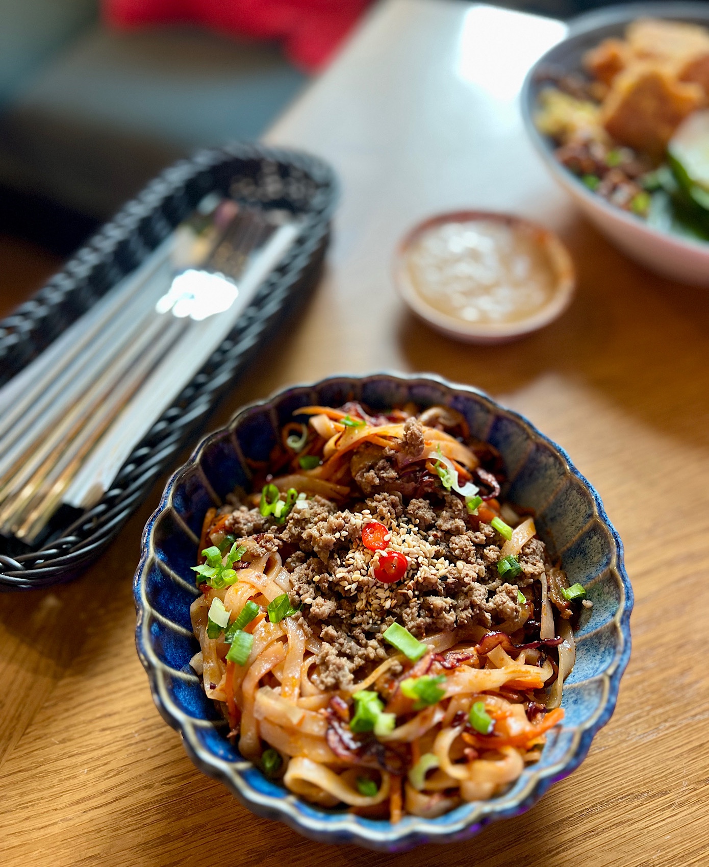 Makaron z wołowiną (40 PLN) jest ideolo. Uczciwych rozmiarów, aromatyczny, gilgający podniebienie odrobiną chili. Coś pięknego.
